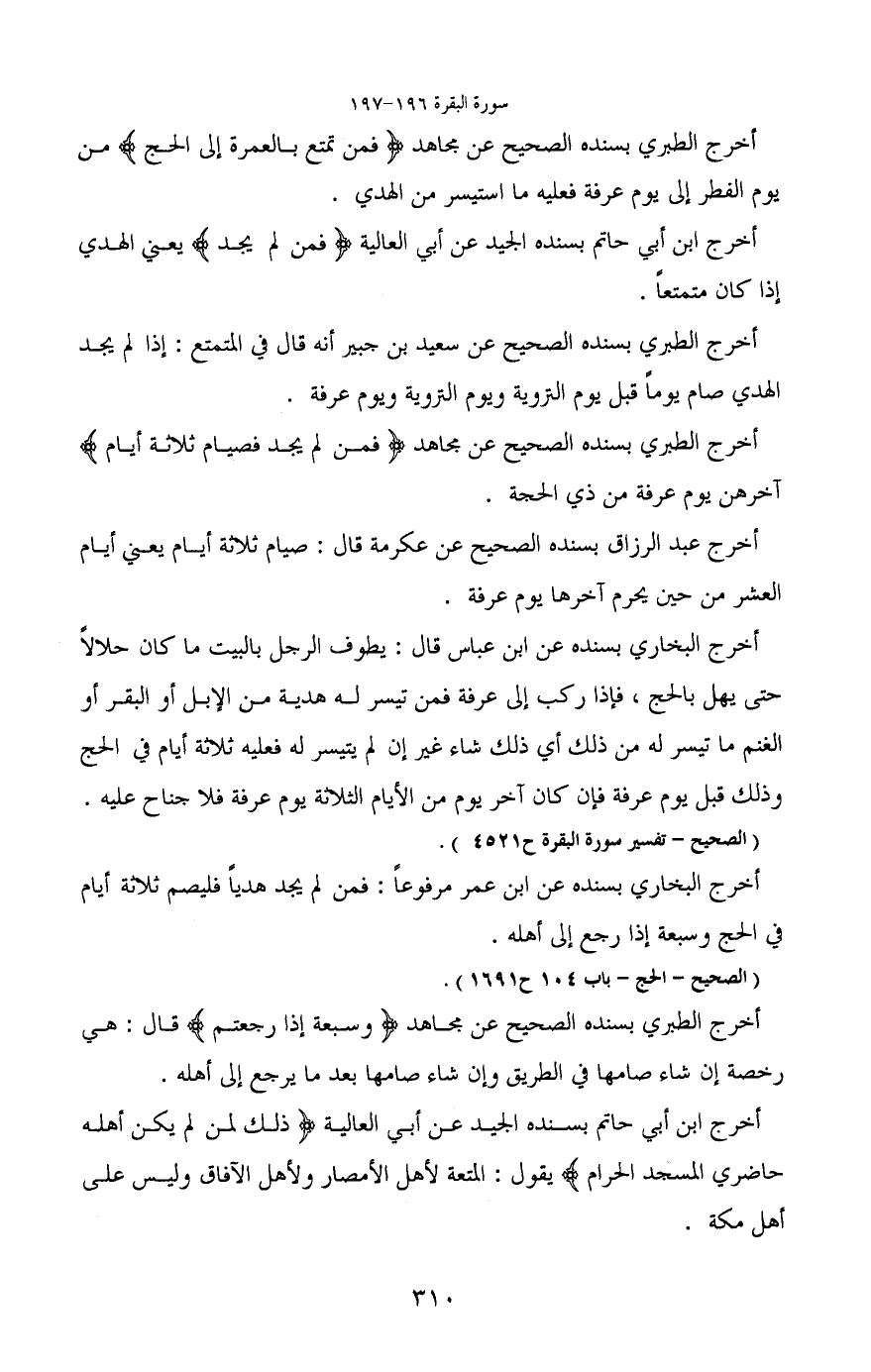 أخرج ابن أبي حاتم بسنده الجيد عن أبي العالية (ذلك لمن لم يكن أهله حاضري المسجد الحرام) يقول: المتعة لأهل الأمصار ولأهل الآفاق وليس على أهل مكة.