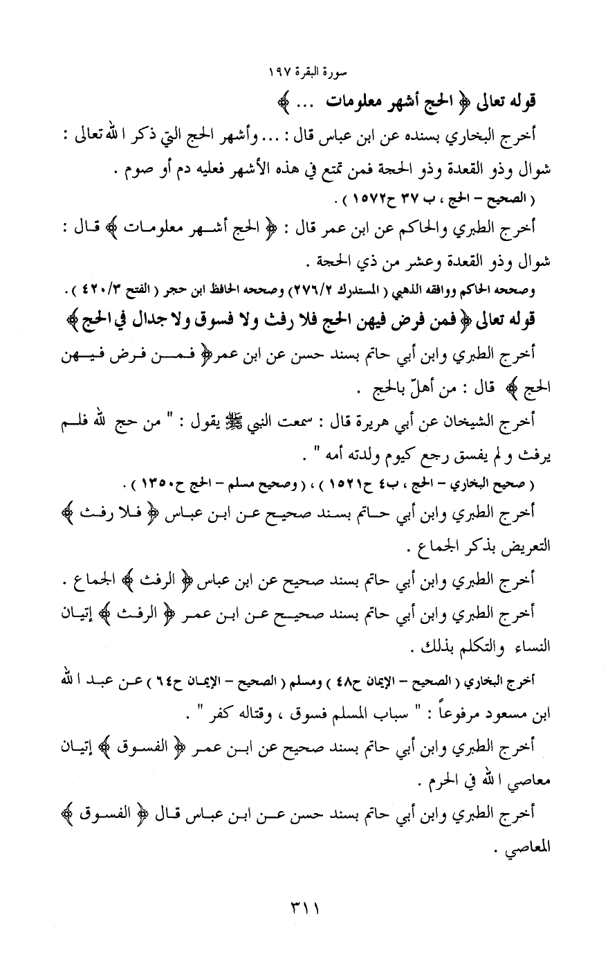 أخرج الطبري وابن أبي حاتم بسند صحيح عن ابن عمر (الفسوق) إتيان معاصي الله في الحرم.