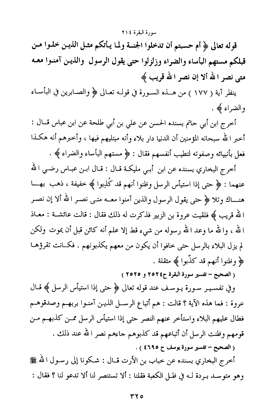 قوله تعالى (أم حسبتم أن تدخلوا الجنة ولما يأتكم مثل الذين خلوا من قبلكم مستهم البأساء والضراء وزلزلوا حتى يقول الرسول والذين آمنوا معه متى نصر الله ألا إن نصر الله قريب)