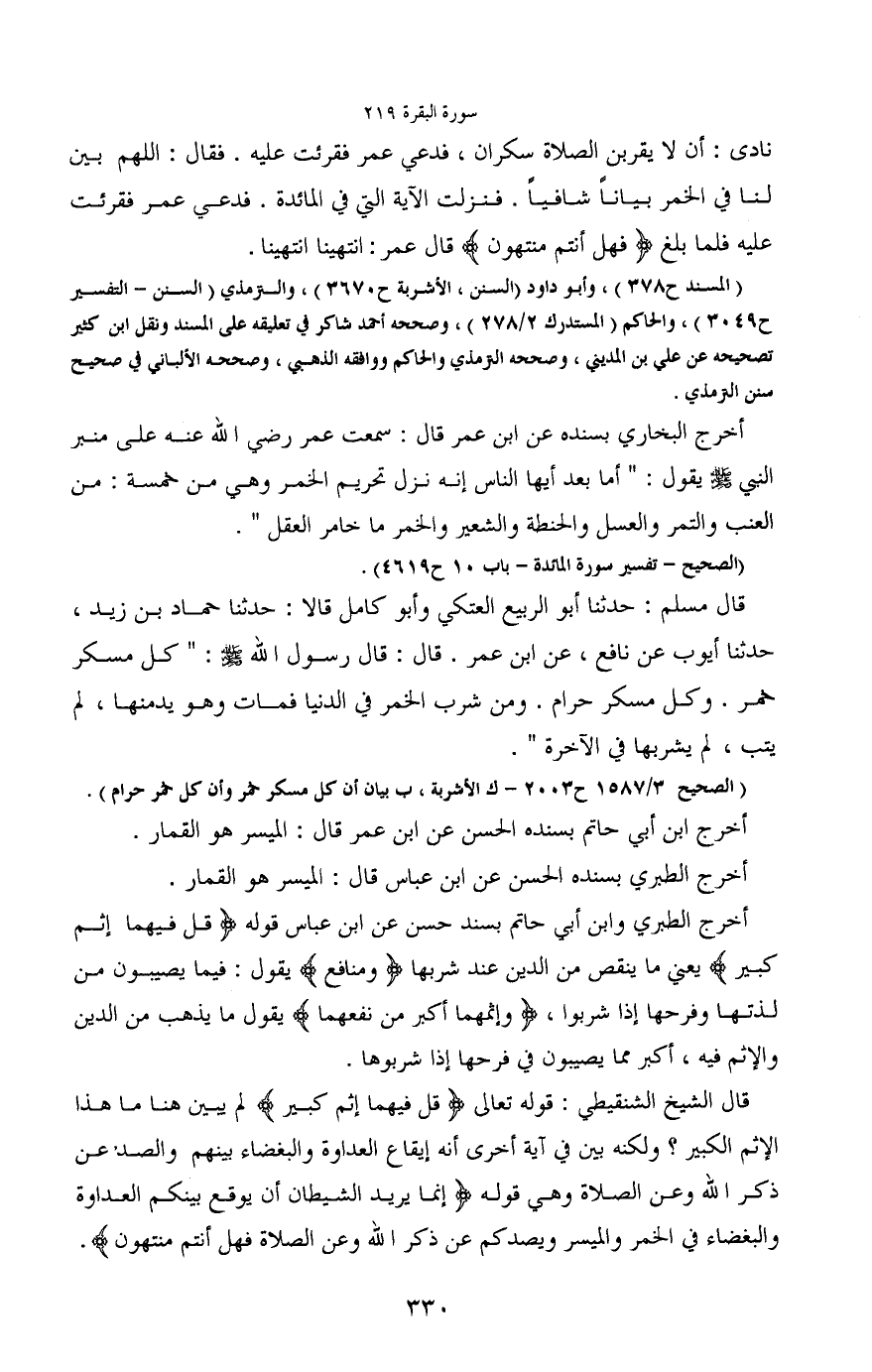 أخرج الطبري وابن أبي حاتم بسند حسن عن ابن عباس قوله (قل فيهما إثم كبير) يعني ما ينقص من الدين عند شربها (ومنافع) يقول: فيما يصيبون من لذتها وفرحها إذا شربوا، (وإثمهما أكبر من نفعهما) يقول ما يذهب من الدين والإثم فيه، أكبر مما يصيبون في فرحها إذا شربوها.