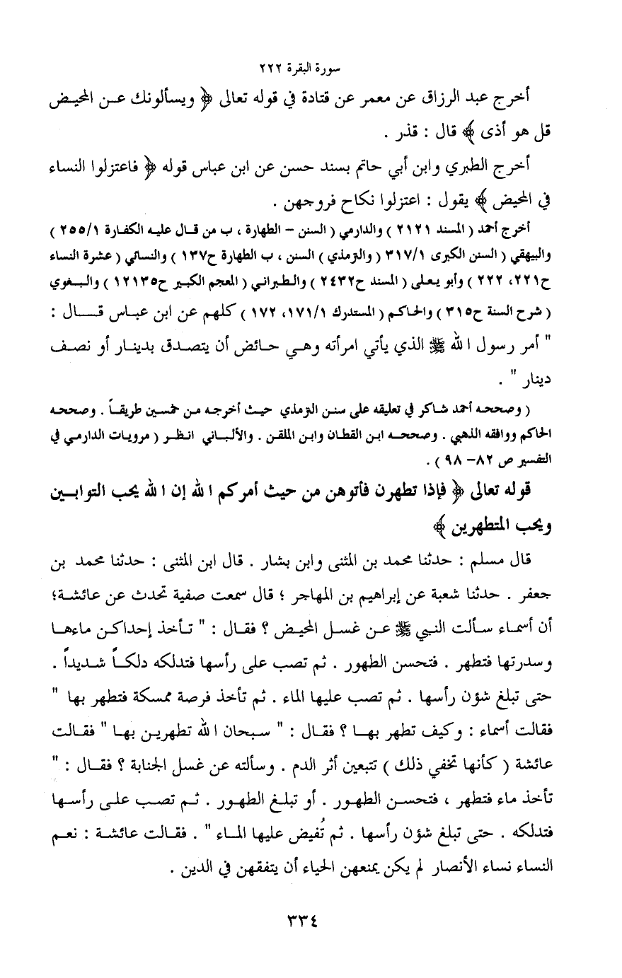 فقالت أسماء: وكيف تطهر بها؟ فقال: "سبحان الله تطهرين بها" فقالت عائشة (كأنها تخفي ذلك) تتبعين أثر الدم. وسألته عن غسل الجنابة؟ فقال: "تأخذ ماء فتطهر، فتحسن الطهور. أو تبلغ الطهور. ثم تصب على رأسها فتدلكه. حتى تبلغ شؤن رأسها. ثم تفيض عليها الماء". فقالت عائشة: نعم النساء نساء الأنصار لم يكن يمنعهن الحياء أن يتفقهن في الدين.