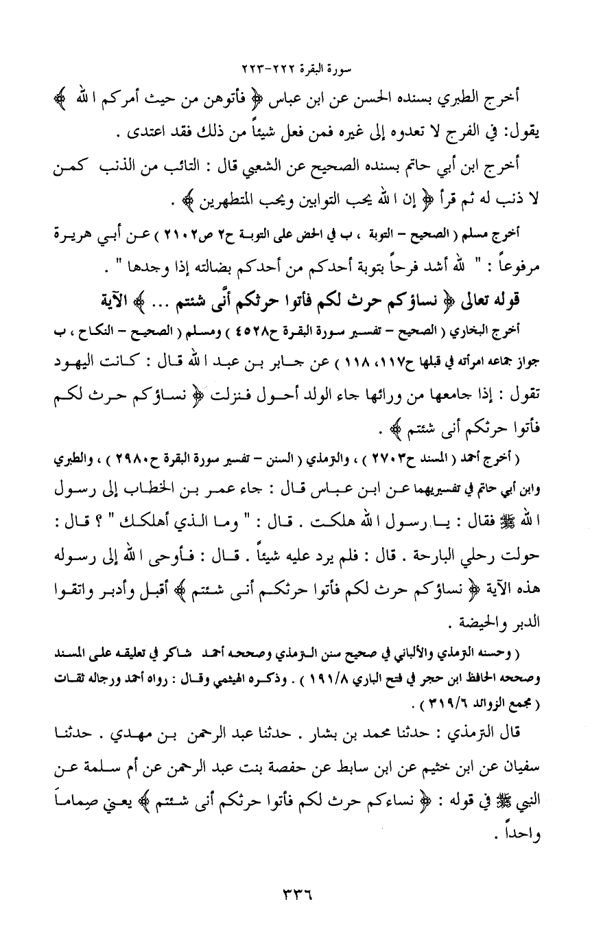 (أخرج أحمد (المسند ح 2703) ، والترمذي (السنن- تفسير سورة البقرة ح 2980) ، والطبري وابن أبي حاتم في تفسيريهما عن ابن عباس قال: جاء عمر بن الخطاب إلى رسول الله - صَلَّى اللَّهُ عَلَيْهِ وَسَلَّمَ - فقال: يا رسول الله هلكت. قال: "وما الذي أهلكك"؟ قال: حولت رحلي البارحة. قال: فلم يرد عليه شيئاً. قال: فأوحى الله إلى رسوله هذه الآية (نساؤكم حرث لكم فأتوا حرثكم أنى شئتم) أقبل وأدبر واتقوا الدبر والحيضة.