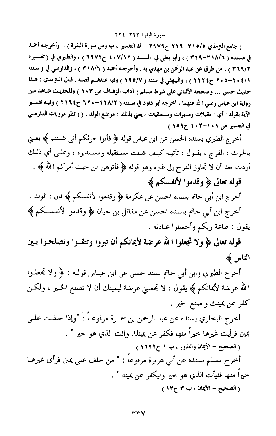 (جامع الترمذي 5/215-216 ح 2979- ك التفسير، ومن سورة البقرة) . وأخرجه أحمد في مسنده (6/318-319) , وأبو يعلى في المسند (12/407 ح 6972) ، والطبري في (تفسيره 2/369) ، من طرق عن عبد الرحمن بن مهدي به. وأخرجه أحمد (6/318) ، والدارمي في (سننه 1/204-205 ح 1124) ، والبيهقي في سننه (7/195) وفيه عندهم قصة. قال الترمذي: هذا حديث حسن ... وصححه الألباني على شرط مسلم (آداب الزفاف ص 103) وللحديث شاهد من رواية ابن عباس - رضي الله عنه -، أخرجه أبو داود في سننه (2/618-620 ح 2164) وفيه تفسير الآية بقوله: أي: مقبلات ومدبرات ومستلقيات، يعني بذلك: موضع الولد. (وانظر مرويات الدارمي في التفسير ص 101-102 ح 159) .