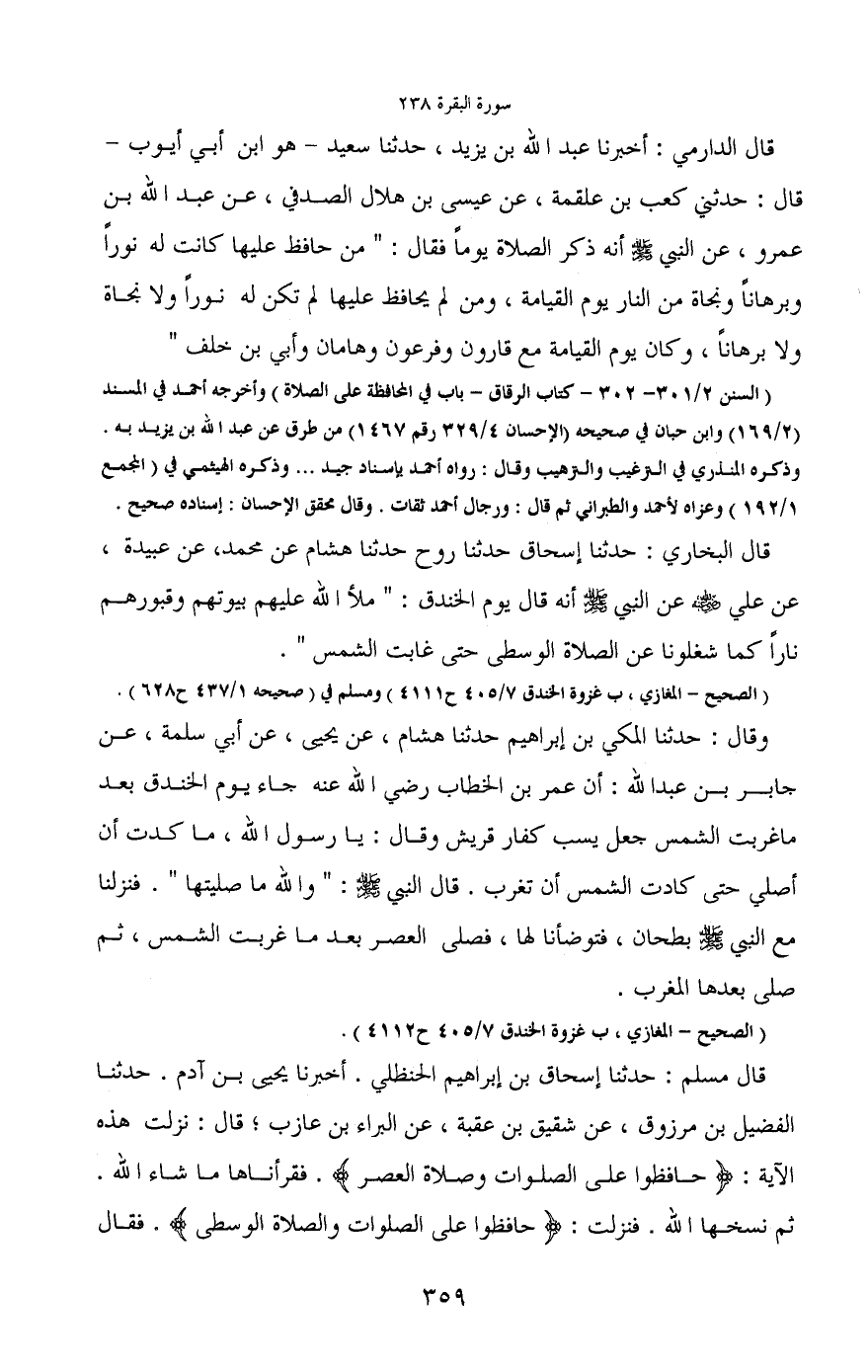 قال البخاري: حدثنا إسحاق حدثنا روح حدثنا هشام عن محمد، عن عبيدة، عن علي - رضي الله عنه - عن النبي - صَلَّى اللَّهُ عَلَيْهِ وَسَلَّمَ - أنه قال يوم الخندق: "ملأ الله عليهم بيوتهم وقبورهم ناراً كما شغلونا عن الصلاة الوسطى حتى غابت الشمس".