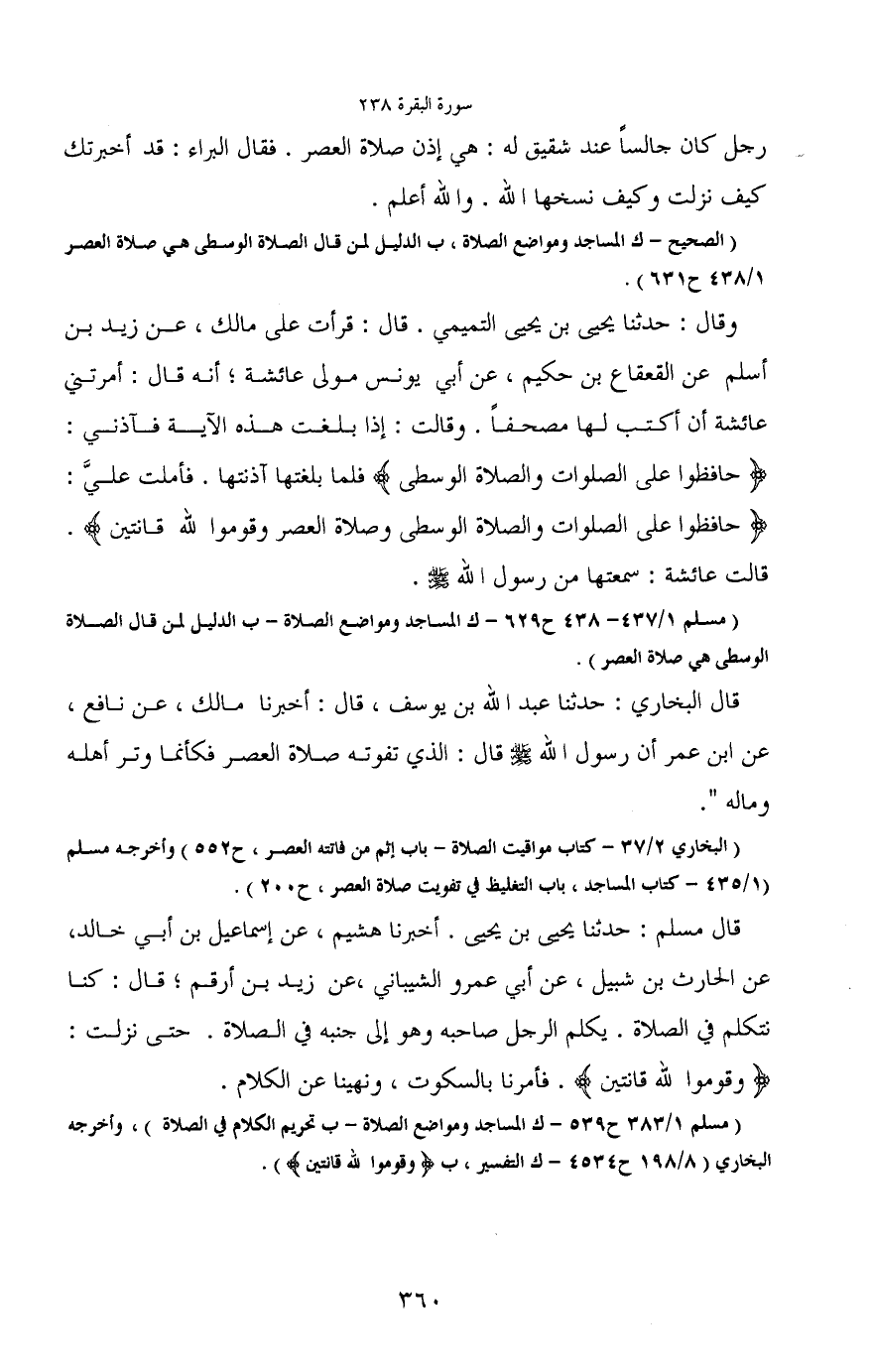 قال مسلم: حدثنا يحيى بن يحيى. أخبرنا هشيم، عن إسماعيل بن أبي خالد، عن الحارث بن شبيل، عن أبي عمرو الشيباني، عن زيد بن أرقم؛ قال: كنا نتكلم في الصلاة. يكلم الرجل صاحبه وهو إلى جنبه في الصلاة. حتى نزلت: (وقوموا لله قانتين) . فأمرنا بالسكوت، ونهينا عن الكلام.