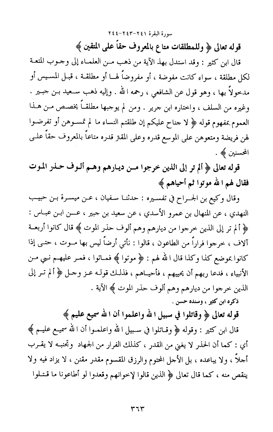 قال ابن كثير: وقوله (وَقَاتِلُوا فِي سَبِيلِ اللَّهِ وَاعْلَمُوا أَنَّ اللَّهَ سَمِيعٌ عَلِيمٌ)