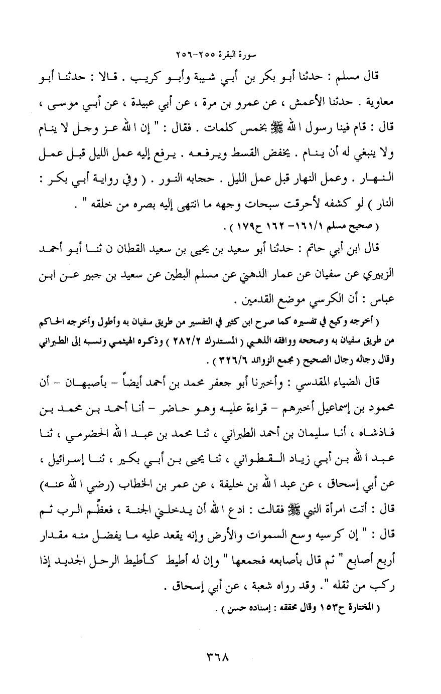 قال مسلم: حدثنا أبو بكر بن أبي شيبة وأبو كريب. قالا: حدثنا أبو معاوية. حدثنا الأعمش، عن عمرو بن مرة، عن أبي عبيدة، عن أبي موسى، قال: قام فينا رسول الله - صَلَّى اللَّهُ عَلَيْهِ وَسَلَّمَ - بخمس كلمات. فقال: "إن الله عز وجل لا ينام ولا ينبغي له أن ينام. يخفض القسط ويرفعه. يرفع إليه عمل الليل قبل عمل النهار. وعمل النهار قبل عمل الليل. حجابه النور. (وفي رواية أبي بكر: النار) لو كشفه لأحرقت سبحات وجهه ما انتهى إليه بصره من خلقه".