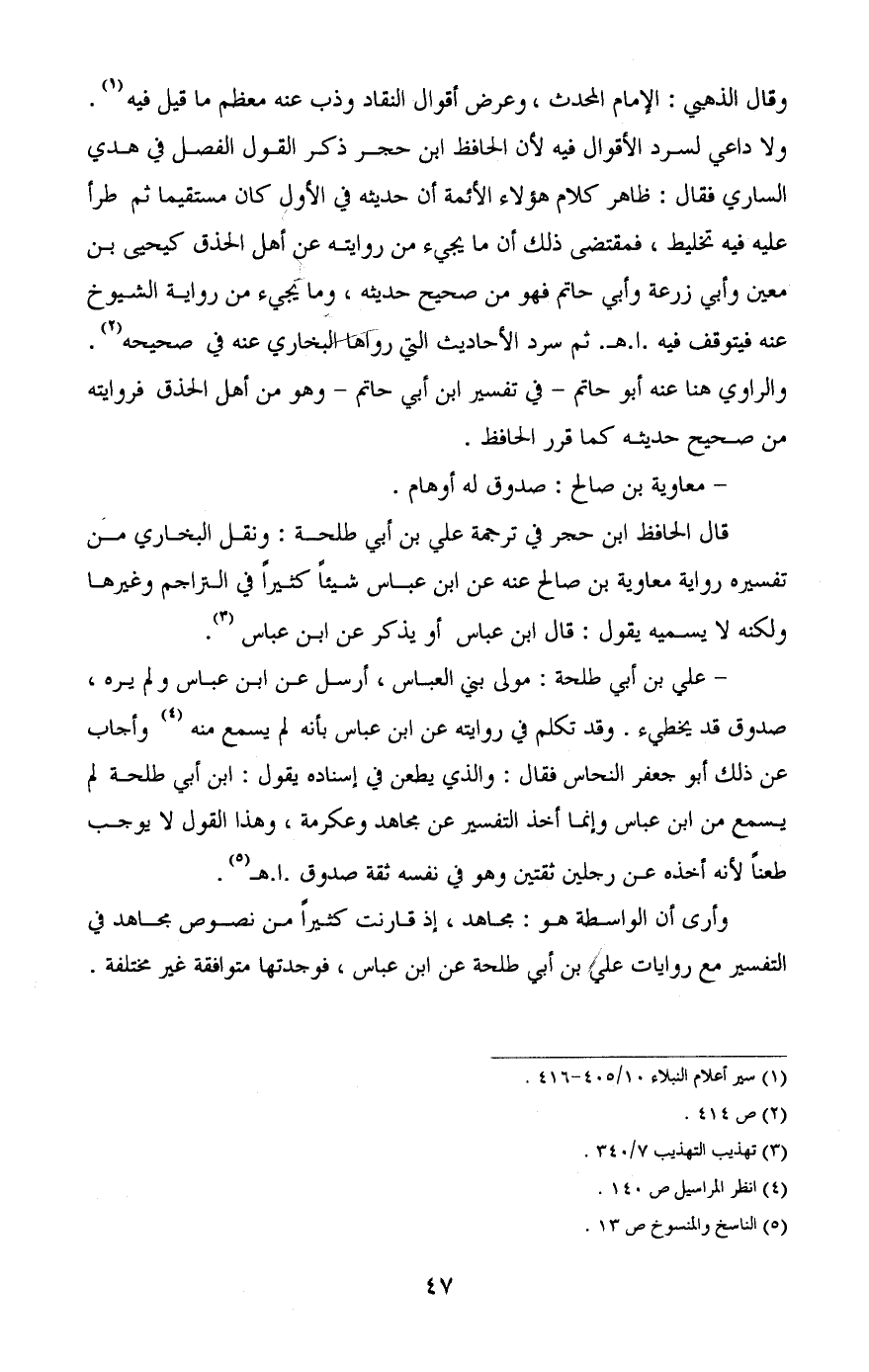 وأرى أن الواسطة هو: مجاهد، إذ قارنت كثير من نصوص مجاهد في التفسير مع روايات علي ابن أبي طلحة عن ابن عباس، فوجدتها متوافقة غير مختلفة.