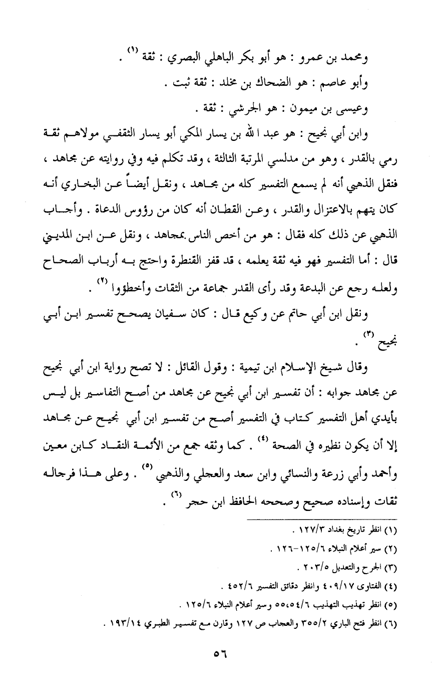 وابن أبي نجيح: هو عبد الله بن يسار المكي أبو يسار الثقفي مولاهم ثقة رمي بالقدر، وهو من مدلسي المرتبة الثالثة، وقد تُكلم فيه وفي روايته عن مجاهد، فنقل الذهبي أنه لم يسمع التفسير كله من مجاهد، ونقل أيضاً عن البخاري أنه كان يتهم بالاعتزال والقدر، وعن القطان أنه كان من رؤوس الدعاة. وأجاب الذهبي عن ذلك كله فقال: هو من أخص الناس بمجاهد، ونقل عن ابن المديني قال: أما التفسير فهو فيه ثقة يعلمه، قد قفز القنطرة واحتج به أرباب الصحاح ولعله رجع عن البدعة وقد رأى القدر جماعة من الثقات وأخطؤوا (¬2) .