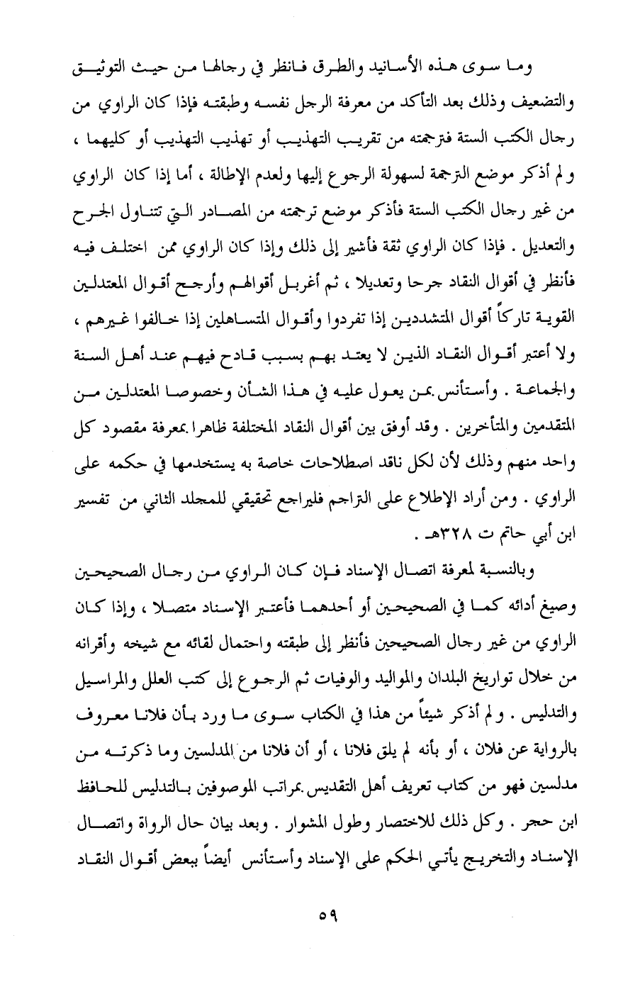 وما سوى هذه الأسانيد والطرق فانظر في رجالها من حيث التوثيق والتضعيف وذلك بعد التأكد من معرفة الرجل نفسه وطبقته فإذا كان الراوي من رجال الكتب الستة فترجمته من تقريب التهذيب أو تهذيب التهذيب أو كليهما، ولم أذكر موضع الترجمة لسهولة الرجوع إليها ولعدم الإِطالة، أما إذا كان الراوي من غير رجال الكتب الستة فأذكر موضع ترجمته من المصادر التي تتناول الجرح والتعديل. فإذا كان الراوي ثقة فأشير إلى ذلك وإذا كان الراوي ممن اختلف فيه فأنظر في أقواله النقاد جرحا وتعديلا، ثم أغربل أقوالهم وأرجح أقوال المعتدلين القوية تاركا أقوال المتشددين إذا تفردوا وأقوال المتساهلين إذا خالفوا غيرهم، ولا أعتبر أقوال النقاد الذين لا يعتد بهم بسبب قادح فيهم عند أهل السنة والجماعة. وأستأنس بمن يعول عليه في هذا الشأن وخصوصا المعتدلين من المتقدمين والمتأخرين. وقد أوفق بين أقوال النقاد المختلفة ظاهرا بمعرفة مقصود كل واحد منهم وذلك لأن لكل ناقد اصطلاحات خاصة به يستخدمها في حكمه على الراوي. ومن أراد الاطلاع على التراجم فليراجع تحقيقي للمجلد الثاني من تفسير ابن أبي حاتم الرازي ت 328 هـ.