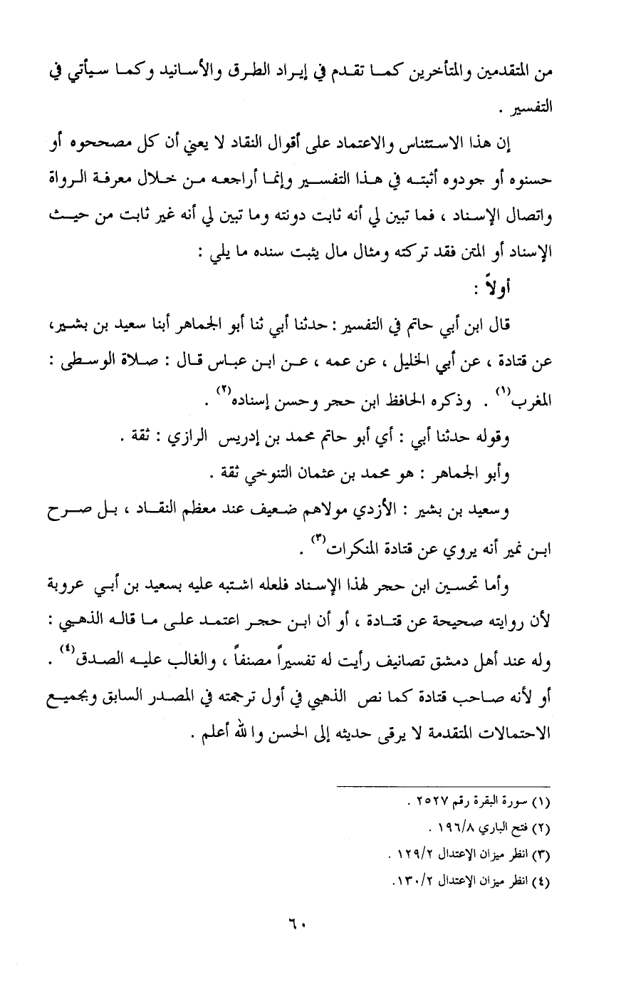 وأما تحسين ابن حجر لهذا الإسناد فلعله اشتبه عليه بسعيد بن أبي عروبة لأن روايته صحيحة عن قتادة، أو أن ابن حجر اعتمد على ما قاله الذهبي: وله عند أهل دمشق تصانيف رأيت له تفسيرا مصنفا، والغالب عليه الصدق (¬4) .