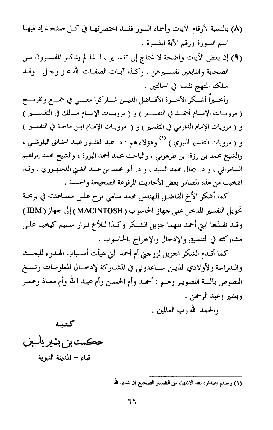 كما أشكر الأخ الفاضل المهندس محمد سامي فرج على مساعدته في برمجة تحويل التفسير المدخل على جهاز الحاسوب (MACINTOSH) إلي جهاز (IBM) وقد نفذها ابني أحمد فلهما جزيل الشكر وكذا للأخ نزار سليم كيخيا على مشاركته في التنسيق والإدخال والإخراج بالحاسوب.