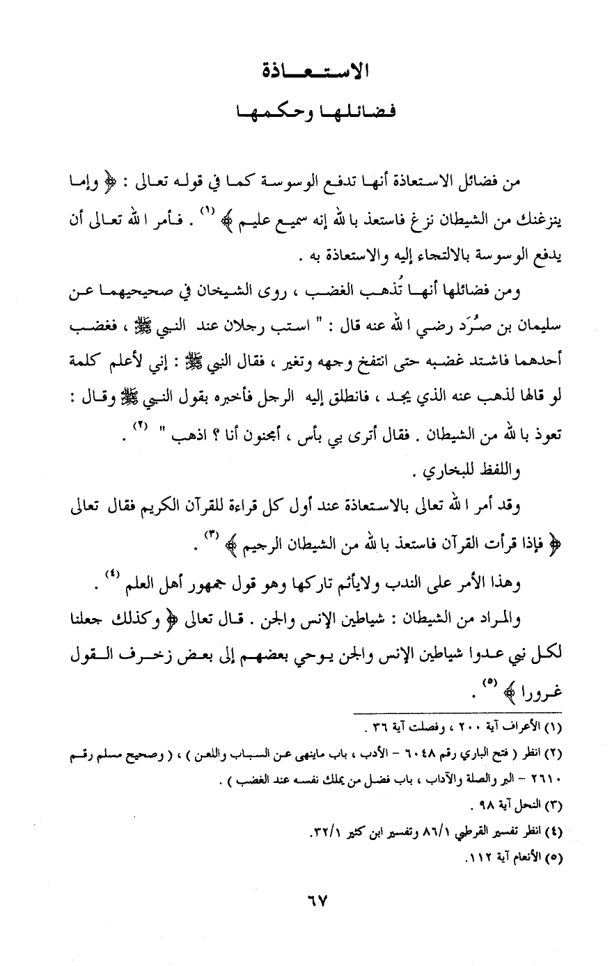 وقد أمر الله تعالى بالاستعاذة عند أول كل قراءة للقرآن الكريم فقال تعالى (فَإِذَا قَرَأْتَ الْقُرْآنَ فَاسْتَعِذْ بِاللَّهِ مِنَ الشَّيْطَانِ الرَّجِيمِ) (¬3) .