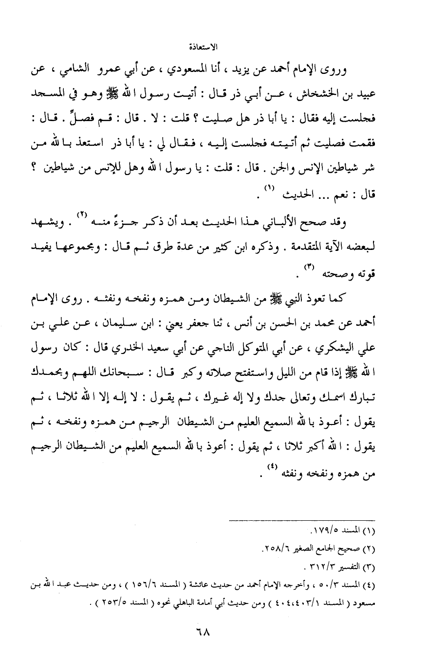 وروى الإمام أحمد عن يزيد، أنا المسعودي، عن أبي عمرو الشامي، عن عبيد بن الخشخاش، عن أبي ذر قال: أتيت رسول الله صَلَّى اللَّهُ عَلَيْهِ وَسَلَّمَ وهو في المسجد فجلست إليه فقال: يا أبا ذر هل صليت؟ قلت: لا. قال: قم فصلَّ. قال: فقمت فصليت ثم أتيته فجلست إليه، فقال لي: يا أبا ذر استعذ بالله من شر شياطين الإِنس والجن. قال: قلت: يا رسول الله وهل للإنس من شياطين؟ قال: نعم ... الحديث (¬1) .