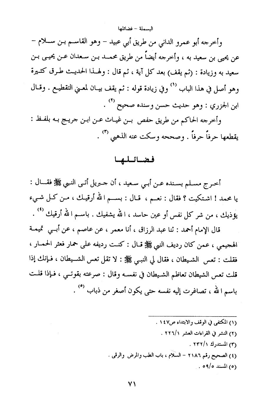أخرج مسلم بسنده عن أبي سعيد أن جبريل أتى النبي صَلَّى اللَّهُ عَلَيْهِ وَسَلَّمَ فقال: يا محمد! اشتكيت؟ فقال: نعم، قال: بسم الله أرقيك، من كل شيء يؤذيك، من شر كل نفس أو عين حاسد، الله يشفيك. باسم الله أرقيك (¬4) .