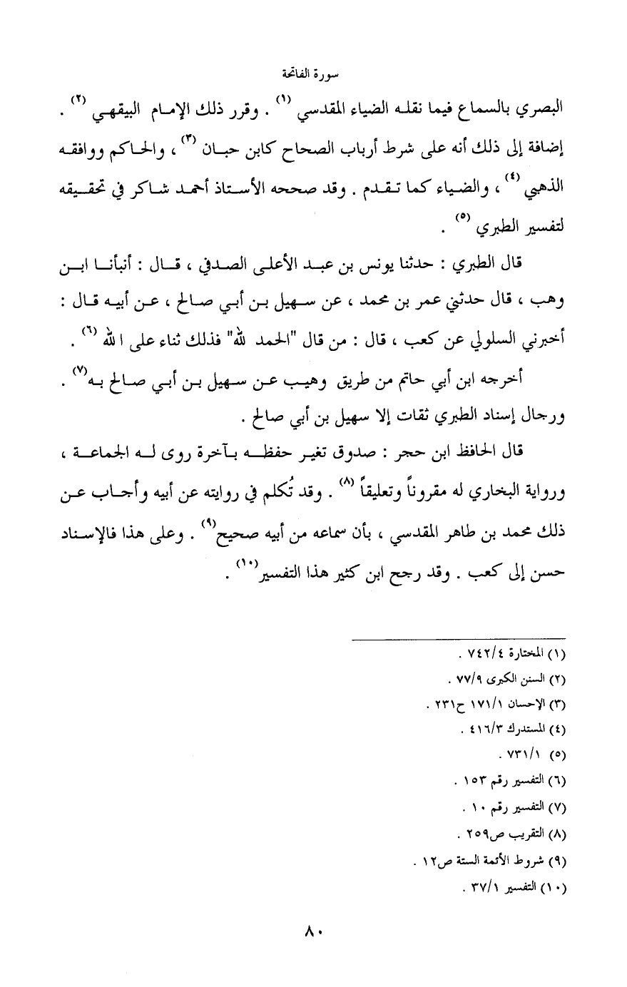 البصري بالسماع فيما نقله الضياء المقدسي (¬1) . وقرر ذلك الإمام البيقهي (¬2) . إضافة إلى ذلك أنه على شرط أرباب الصحاح كابن حبان (¬3) ، والحاكم ووافقه الذهبي (¬4) ، والضياء كما تقدم. وقد صححه الأستاذ أحمد شاكر في تحقيقه لتفسير الطبري (¬5) .