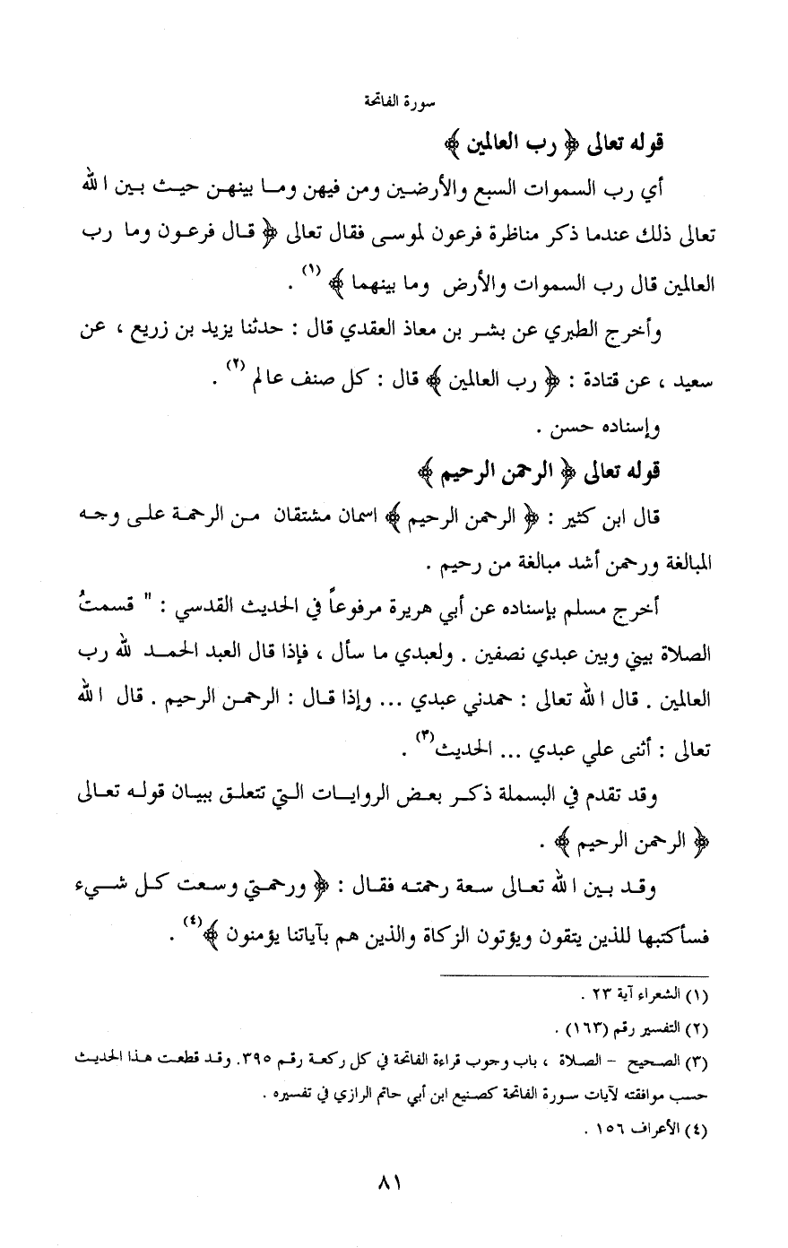 (¬3) الصحيح - الصلاة، باب وجوب قراءة الفاتحة في كل ركعة رقم 395. وقد قطعت هذا الحديث حسب موافقته لآيات سورة الفاتحة كصنيع ابن أبي حاتم الرازي في تفسيره.
