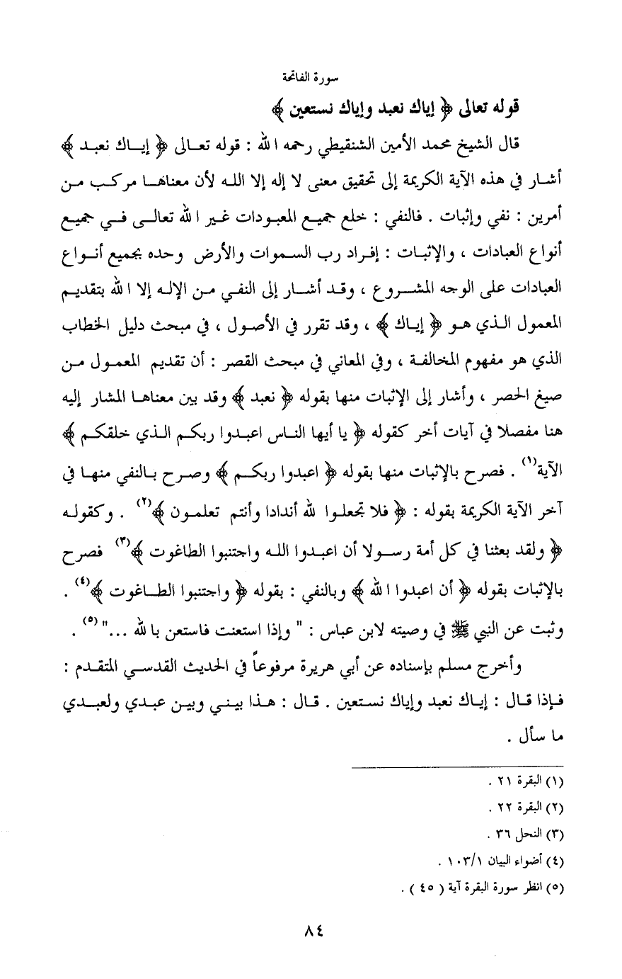 قال الشيخ محمد الأمين الشنقيطي رحمه الله: قوله تعالى (إِيَّاكَ نَعْبُدُ) أشار في هذه الآية الكريمة إلى تحقيق معنى لا إله إلا الله لأن معناها مركب من أمرين: نفي وإثبات. فالنفي: خلع جميع المعبودات غير الله تعالى في جميع أنه العبادات، والإثبات: إفراد رب السماوات والأرض وحده بجميع أنواع العبادات على الوجه المشروع، وقد أشار إلى النفي من الإله إلا الله بتقديم المعمول الذي هو (إياك) ، وقد تقرر في الأصول، في مبحث دليل الخطاب الذي هو مفهوم المخالفة، وفي المعاني في مبحث القصر: أن تقديم المعمول من صيغ الحصر، وأشار إلى الإثبات منها بقوله (نعبد) وقد بين معناها المشار إليه هنا مفصلا في آيات أخر كقوله (يَا أَيُّهَا النَّاسُ اعْبُدُوا رَبَّكُمُ الَّذِي خَلَقَكُم) الآية (¬1) . فصرح بالإثبات منها بقوله (اعْبُدُوا رَبَّكُم) وصرح بالنفي منها في آخر الآية الكريمة بقوله: (فَلا تَجْعَلُوا لِلَّهِ أَنْدَاداً وَأَنْتُمْ تَعْلَمُونَ) . (¬2) وكقوله (وَلَقَدْ بَعَثْنَا فِي كُلِّ أُمَّةٍ رَسُولاً أَنِ اعْبُدُوا اللَّهَ وَاجْتَنِبُوا الطَّاغُوتَ) (¬3) فصرح بالإثبات بقوله (أَنِ اعْبُدُوا اللَّهَ) وبالنفي: بقوله (وَاجْتَنِبُوا الطَّاغُوتَ) (¬4) .