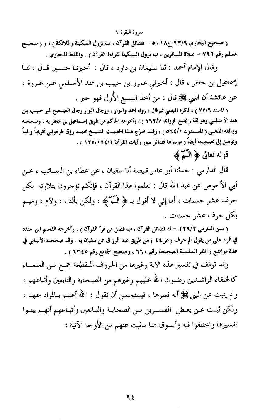 ((سنن الدارمي 2/429 - ك فضائل القرآن، ب فضل من قرأ القرآن) ، وأخرجه أبو القاسم ابن منده في الرد على من يقول الم حرف (ص 44) من طريق عبد الرزاق عن سفيان به. وقد صححه الألباني في عدة مواضع (انظر السلسلة الصحيحة رقم 660، وصحيح الجامع رقم 6345)) .
