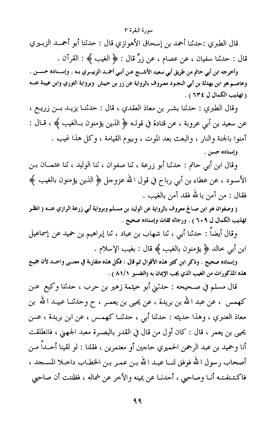 قال الطبري: حدثنا أحمد بن إسحاق الأهوازي قال: حدثنا أبو أحمد الزبيري قال: حدثنا سفيان، عن عاصم، عن زرِّ قال: (بِالْغَيْب) : القرآن.