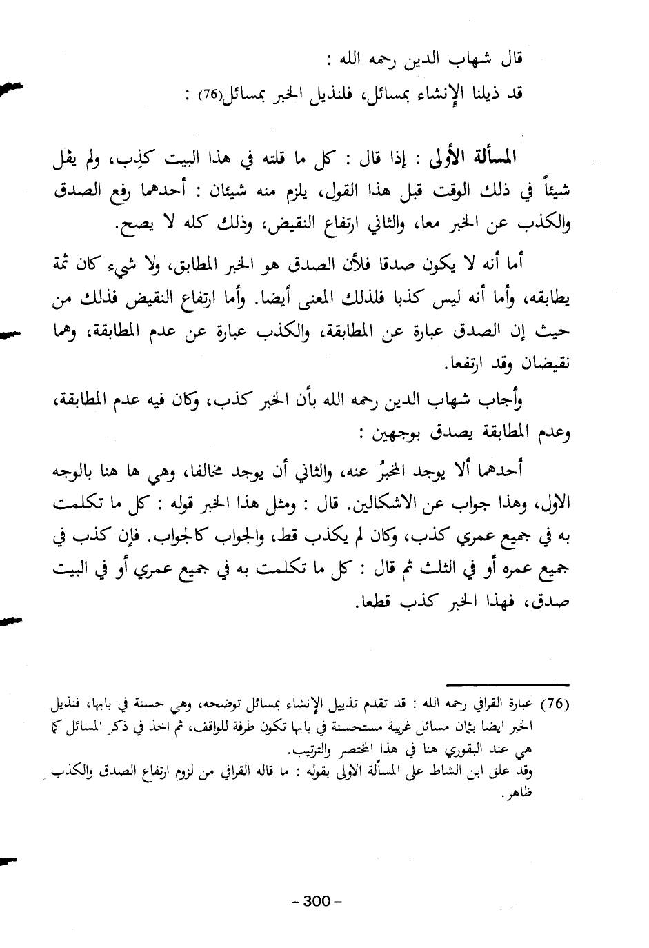 وقد علق ابن الشاط على المسألة الأولى بقوله: ما قاله القرافي من لزوم ارتفاع الصدق والكذب ظاهر.