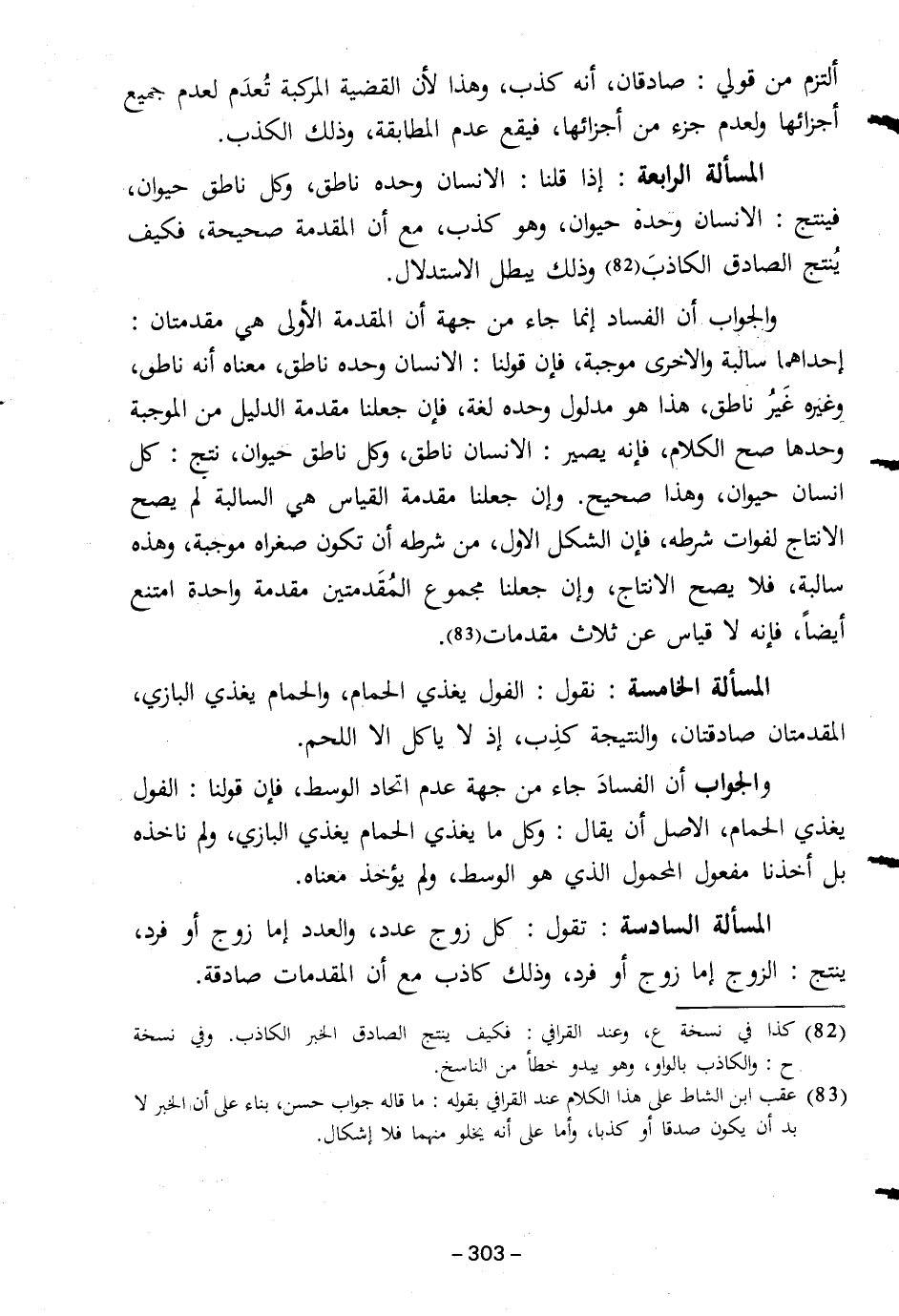 (٨٢) كذا في نسخة ع، وعند القرافي: فكيف ينتج الصادق الخبر الكاذب. وفي نسخة ح: والكاذب بالواو، وهو يبدو خطأ من الناسخ.