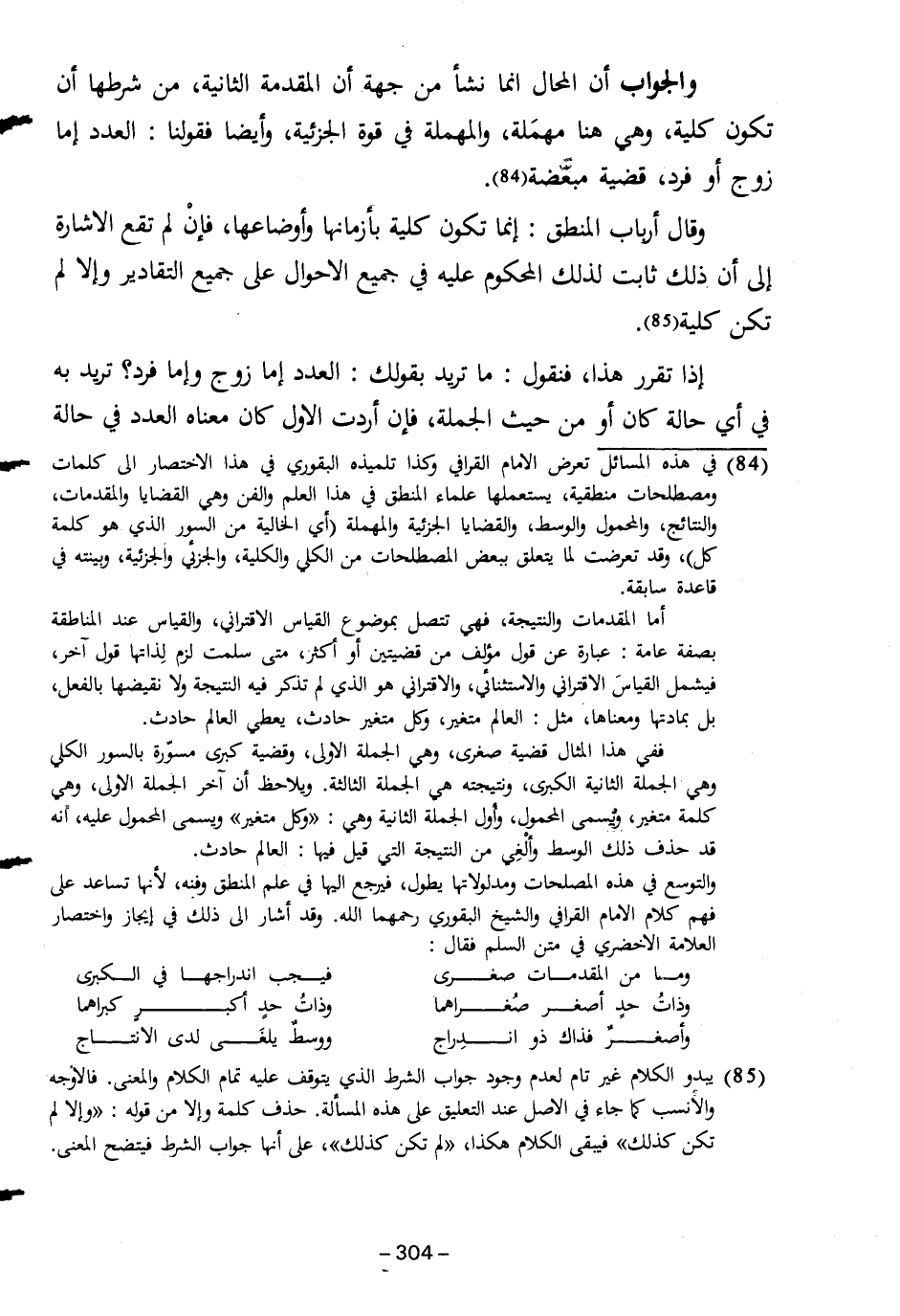 (٨٤) في هذه المسائل تعرض الإِمام القرافي وكذا تلميذه البقوري في هذا الاختصار إلى كلمات ومصطلحات منطقية، يستعملها علماء المنطق في هذا العلم والفن وهي القضايا والمقدمات، والنتائج، والمحمول والوسط، والقضايا الجزئية والمهملة (أي الخالية من السور الذي هو كلمة كل)، وقد تعرضت لما يتعلق ببعض المصطلحات من الكلي والكلية، والجزئي والجزئية، وبينته في قاعدة سابقة.