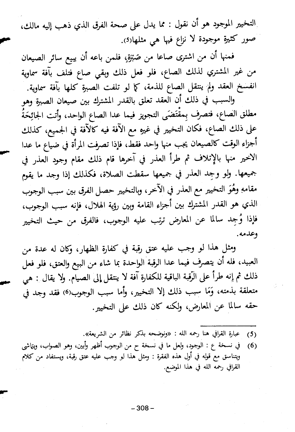 (٦) في نسخة ع: الوجود، ولعل ما في نسخة ح من الوجوب أظهر وأبين، وهو الصواب، ويتماشى ويتناسق مع قوله في أول هذه الفقرة: ومثل هذا لو وجب عليه عتق رقبة، ويستفاد من كلام القرافي رحمه الله في هذا الموضع.