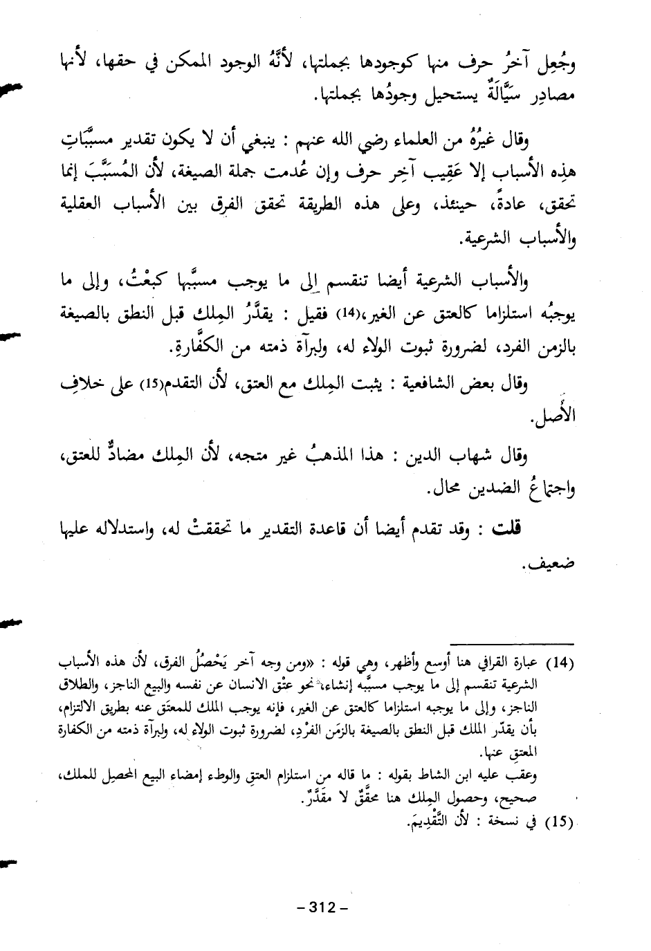 (١٤) عبارة القرافي هنا أوسع وأظهر، وهي قوله: "ومن وجه آخر يَحْصُلُ الفرق، لأن هذه الأسباب الشرعية تنقسم إلى ما يوجب مسبَّبه إنشاء، نحو عتْق الإنسان عن نفسه والبيع الناجز، والطلاق الناجز، وإلى ما يوجبه استلزاما كالعتق عن الغير، فإنه يوجب الملك للمعتَق عنه بطريق الالتزام، بأن يقدّر الملك قبل النطق بالصيغة بالزمَن الفرْدِ، لضرورة ثبوت الولاء له، ولبرآة ذمته من الكفارة المعتقِ عنها.
