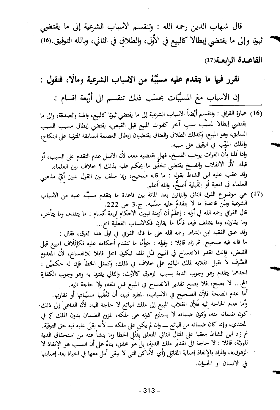 (١٧) هي موضوع الفرق الثاني والثمانين بعد المائة بين قاعدة ما يتقدم مسبّبُه عليه من الأسباب الشرعية وبيْن قاعدة ما لا يتقدمُ عليه مسَّببه. جـ ٣ ص ٢٢٢.