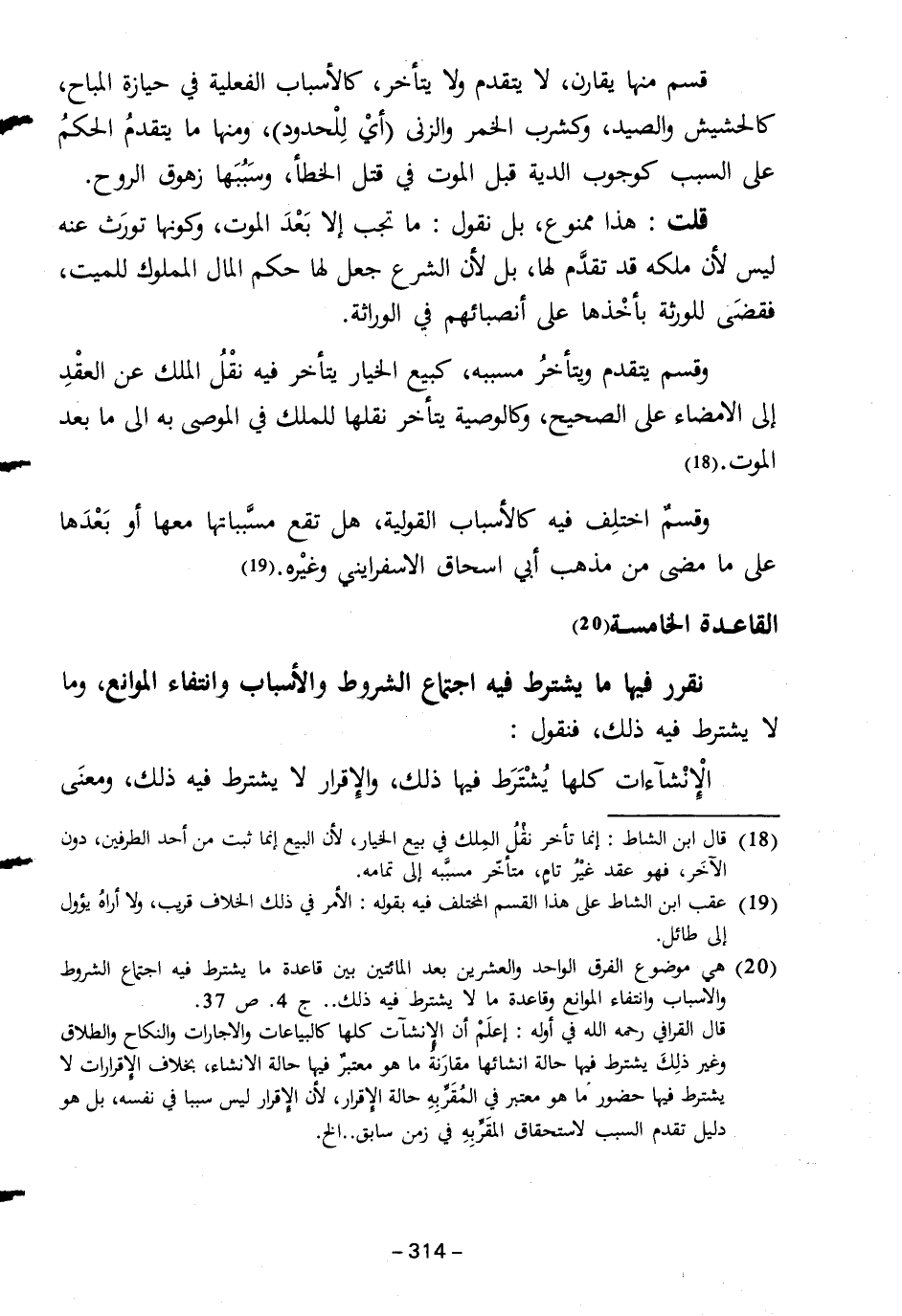 (٢٠) هي موضوع الفرق الواحد والعشرين بعد المائتين بين قاعدة ما يشترط فيه اجتماع الشروط والأسباب وانتفاء الموانع وقاعدة ما لا يشترط فيه ذلك .. جـ ٤. ص ٣٧.