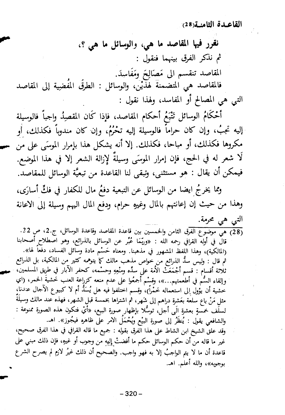 (٢٨) هي موضوع. الفرق الثامن والخمسين بين قاعدة المقاصد وقاعدة الوسائل، جـ ٢، ص ٣٢. قال في أوله القرافي رحمه الله: "وربّمَا عُبِّر عن الوسائل بالذرائع، وهو اصطلاح أصحابنا (المالكية)، وهذا اللفظ الشهور في مذهبنا. ومعناه حَسْم مادة وسائل الفساد، دفعًا لها". ثم قال: وليس سدُّ الذرائع من خواص مذهب مالك كما يتوهمه كثير من المالكية، بل الذرائع ثلاثة أقسام: قسم أجْمَعَتْ الأمة على سدِّه ومنْعِهِ وحسْمه، كحفر الآبار في طريق المسلمين، وإلقاء السُّم في أطعمتهم ... "، وقسم أجمعُوا على عدم منعه كزراعة العنب خَشيةَ الخمر، (أي خشية أن يؤول إلى استعماله خَمْرًا)، وقسم اختلفوا فيه هل يُسَدُّ أم لا كبيوع الآجال عندنا، مثل مَنْ باع سلعة بعَشرة دراهم إلى شَهر، ثم اشتراها بخمسة قبل الشهر، فهذه عند مالك وسيلَةٌ لسلَف خمسةٍ بعشرة إلى أجل، توسُّلا بإظهار صورة البيع، "أيْ فتكون هذه الصورة ممنوعة: والشافعي يقول: يُنظَرُ إلى صورة البيْع ويُحْمَلُ الأمر على ظاهره فيجُوز". اهـ.
