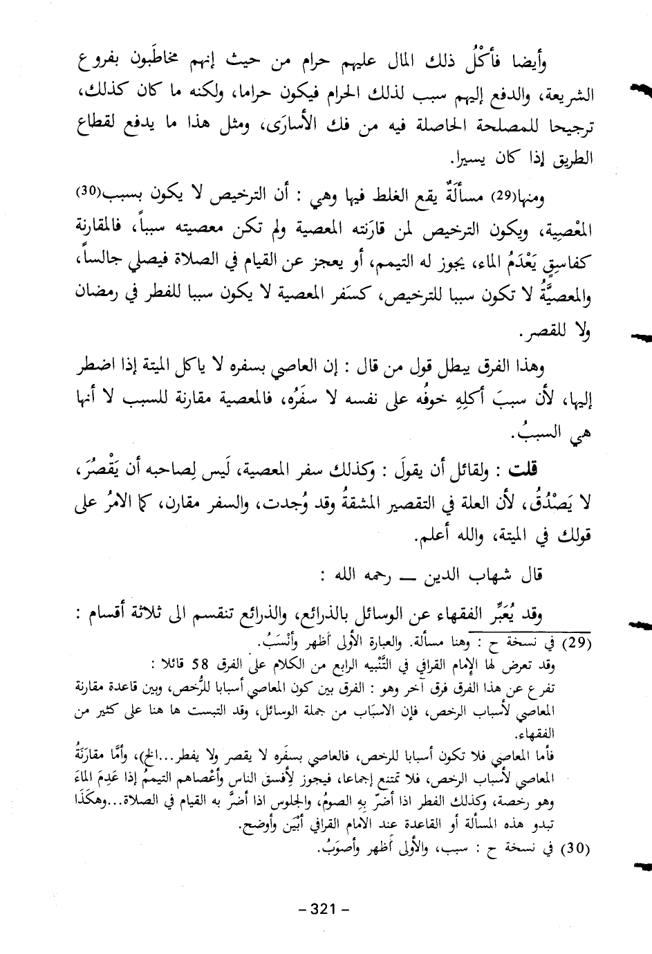فأما المعاصى فلا تكون أسبابا للرخص، فالعاصى بسفَره لا يقصر ولا يفطر ... الخ)، وأمَّا مقارَنَةُ المعاصى لأسباب الرخص، فلا تمتنع إجماعا، فيجوز لِأفسق الناس وأعْصاهم التيممُ إذا عَدِمَ الماءَ وهو رخصة، وكذلك الفطر إذا أضرّ بهِ الصومُ، والجلوس إذا أضرَّ به القيام في الصلاة ... وهكَذَا تبدو هذه المسألة أو القاعدة عند الإِمام القرافي أبْيَن وأوضح.