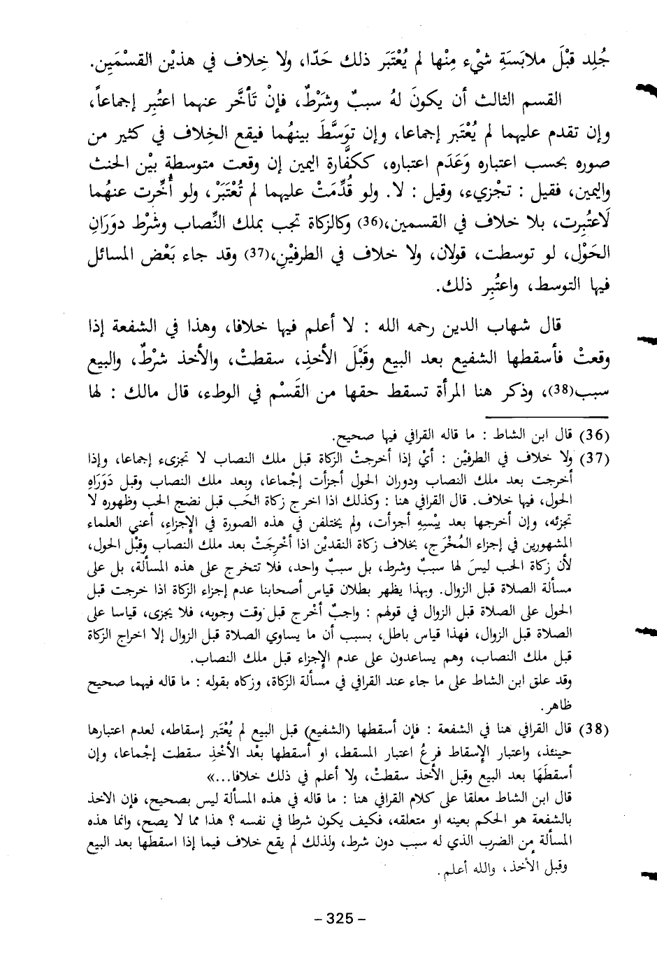(٣٨) قال القرافي هنا في الشفعة: فإن أسقطها (الشفيع) قبل البيع لم يُعْتَبر إسقاطه، لعدم اعتبارها حينئذ، واعتبار الِإسقاط فرعُ اعتبار المسقط، أو أسقطها بعْد الأخْذِ سقطت إجْماعا، وإن أسقطَهَا بعد البيع وقبل الأخذ سقطتْ، ولا أعلم في ذلك خلافًا ... "