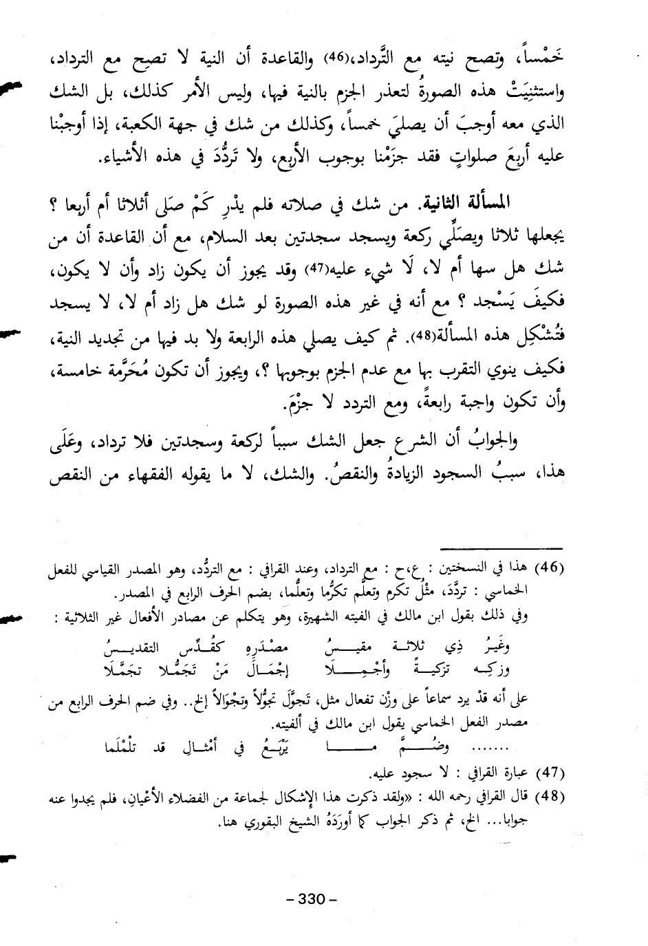 المسألة الثانية. من شك في صلاته فلم يدْرِ كَمْ صَلى أثلاثا أم أربعا؟ يجعلها ثلاثا ويصَلى ركعة ويسجد سجدتين بعد السلام، مع أن القاعدة أن من شك هل سها أم لا، لَا شيء عليه (٤٧) وقد يجوز أن يكون زاد وأن لا يكون، فكيفَ يَسْجد؟ مع أنه في غير هذه الصورة لو شك هل زاد أم لا، لا يسجد فتُشْكِل هذه المسألة (٤٨). ثم كيف يصلي هذه الرابعة ولا بد فيها من تجديد النية، فكيف ينوي التقرب بها مع عدم الجزم بوجوبها؟ ، ويجوز أن تكون مُحَرَّمة خامسة، وأن تكون واجبة رابعةً، ومع التردد لا جزْمَ.