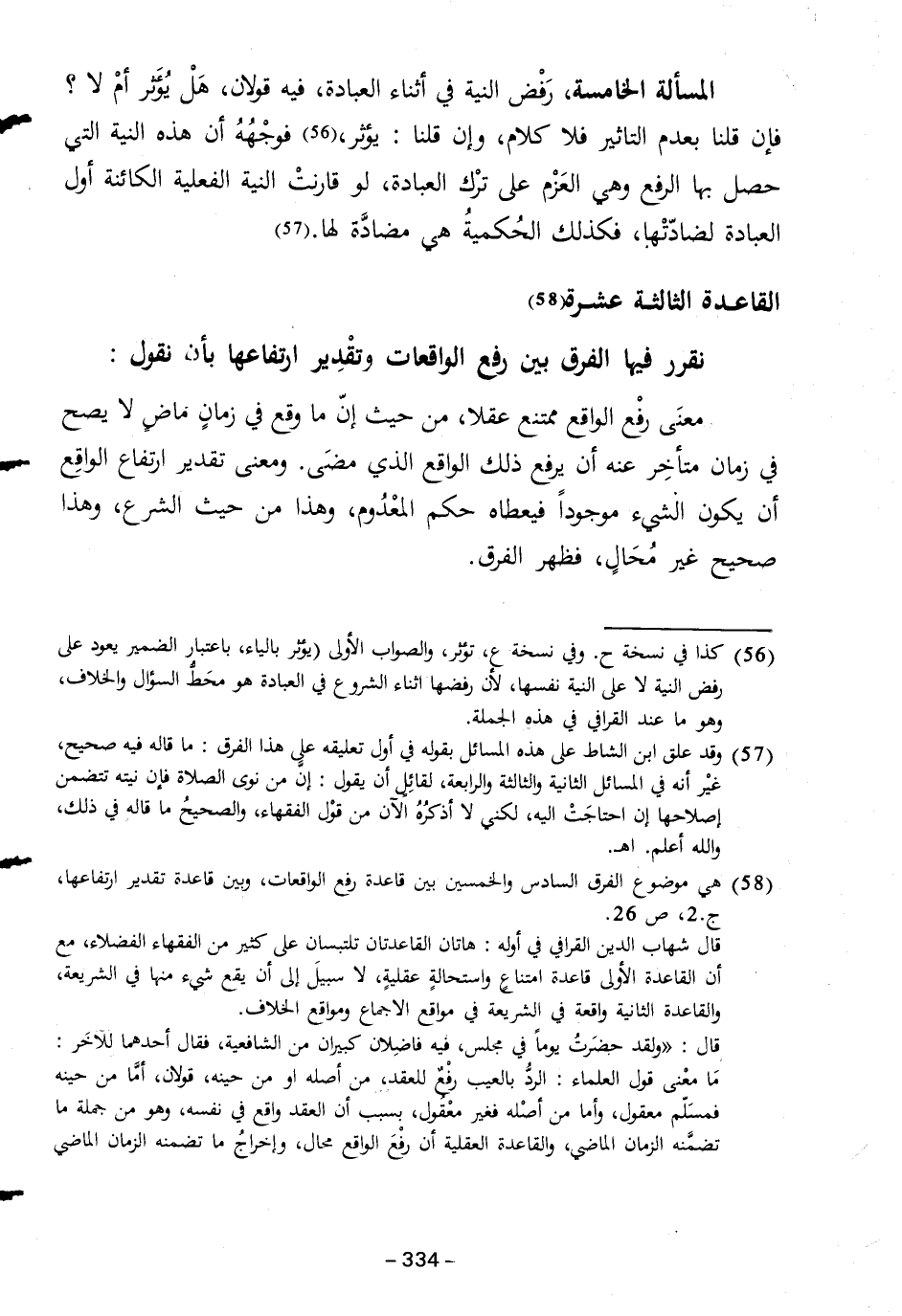 (٥٦) كذا في نسخة ح. وفي نسخة ع، تؤثر، والصواب الأولى (يؤثر بالياء، باعتبار الضمير يعود على رفض النية لا على النية نفسها، لأن رفضها أثناء الشروع في العبادة هو محَطُّ السؤال والخلاف، وهو ما عند القرافي في هذه الجملة.