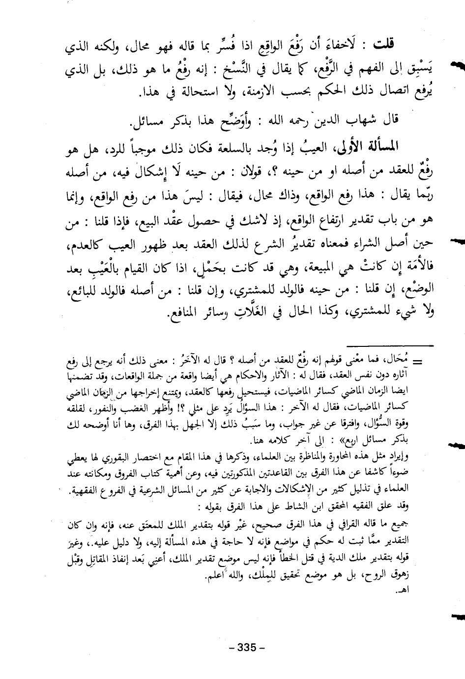 = مُحَال، فما معْنى قولهم إنه رفعٌ للعقد من أصله؟ قال له الآخَرُ: معنى ذلك أنه يرجع إلى رفع آثاره دون نفس العقد، فقال له: الآثار والأحكام هي أيضا واقعة من جملة الواقعات، وقد تضمنها أيضا الزمان الماضى كسائر الماضيات، فيستحيل رفعها كالعقد، ويمتنع إخراجها من الزمان الماضى كسائر الماضيات، فقال له الآخر: هذا السؤالُ يَرِد على مثلى؟ ! وأظهر الغضب والنفور، لقلقه وقوة السُّؤال، وافترقا عن غير جواب، وما سَببُ ذلك إلا الجهل بهذا الفرق، وها أنا أوضحه لك بذكر مسائل أربع": إلى آخر كلامه هنا.