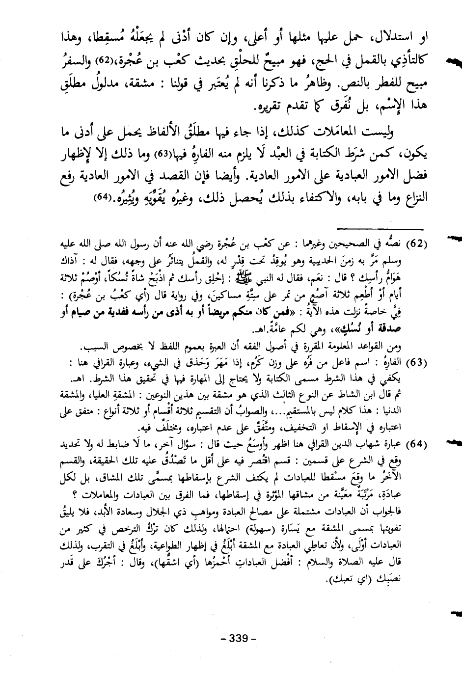 (٦٤) عبارة شهاب الدين القرافي هنا أظهر وأوسعُ حيث قال: سؤال آخر، ما لَا ضابط له ولا تحديد وقع في الشرع على قسمين: قسم اقتُصر فيه على أقل ما تَصْدُقُ عليه تلك الحقيقة، والقسم الآخَرُ ما وقعَ مسْقطا للعبادات لم يكتف الشرع بإسقاطها بمسمَّى تلك المشاق، بل لكل عبادَةِ، مَرْتَبَة معَيَّنة من مشاقها المؤثرة في إسقاطها، فما الفرق بين العبادات والمعاملات؟