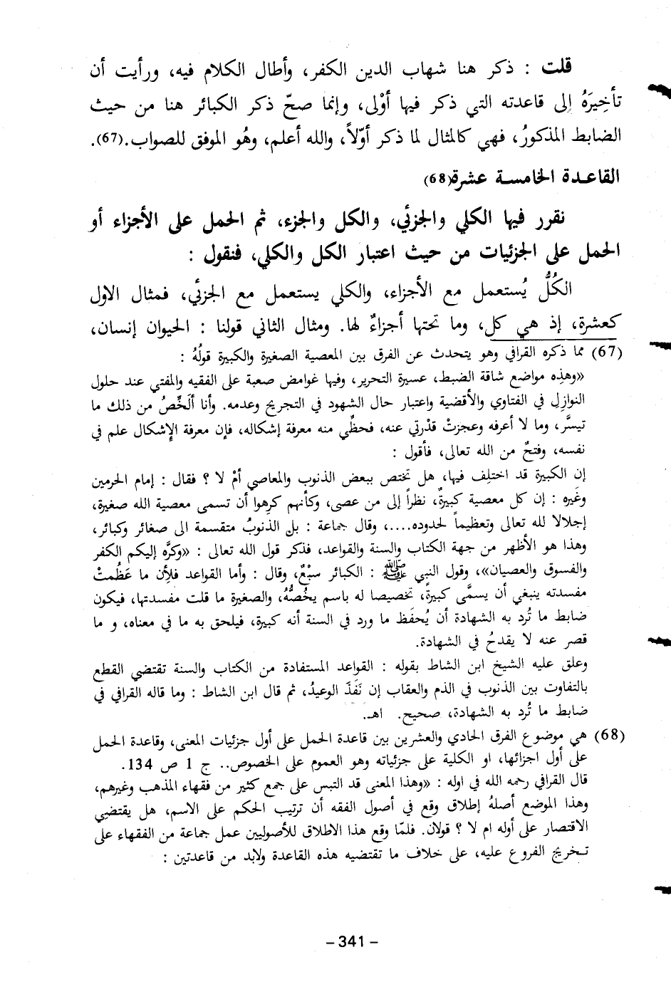 قلت: ذكر هنا شهاب الدين الكفر، وأطال الكلام فيه، ورأيت أن تأخِيرَهُ إِلى قاعدته التي ذكر فيها أوْلى، وإنما صحّ ذكر الكبائر هنا من حيث الضابط المذكورُ، فهي كالمثال لما ذكر أوّلاً، والله أعلم، وهُو الموفق للصواب. (٦٧).