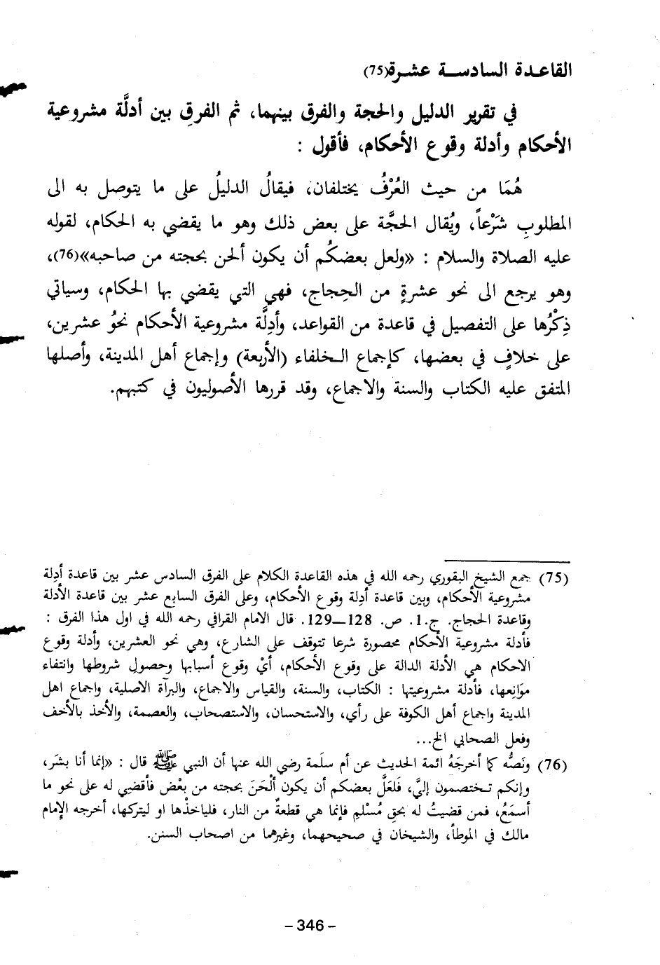 (٧٥) جمع الشيخ البقوري رحمه الله في هذه القاعدة الكلام على الفرق السادس عشر بين قاعدة أدِلة مشروعية الأحكام، وبين قاعدة أدِلة وقوع الأحكام، وعلى الفرق السابع عشر بين قاعدة الأدلة وقاعدة الحجاج. جـ ١. ص. ١٢٨ - ١٢٩. قال الإِمام القرافي رحمه الله في أول هذا الفرق: فأدلة مشروعية الأحكام محصورة شرعا تتوقف على الشارع، وهي نحو العشرين، وأدلة وقوع الأحكام هي الأدلة الدالة على وقوع الأحكام، أيْ وقوع أسبابها وحصولِ شروطها وانتفاء موَانِعها، فأدلة مشروعيتها: الكتاب، والسنة، والقياس والإجماع، والبراءة الأصلية، وإجماع أهل المدينة وإجماع أهل الكوفة على رأي، والاستحسان، والاستصحاب، والعصمة، والأخذ بالأخف وفعل الصحابي الخ ...
