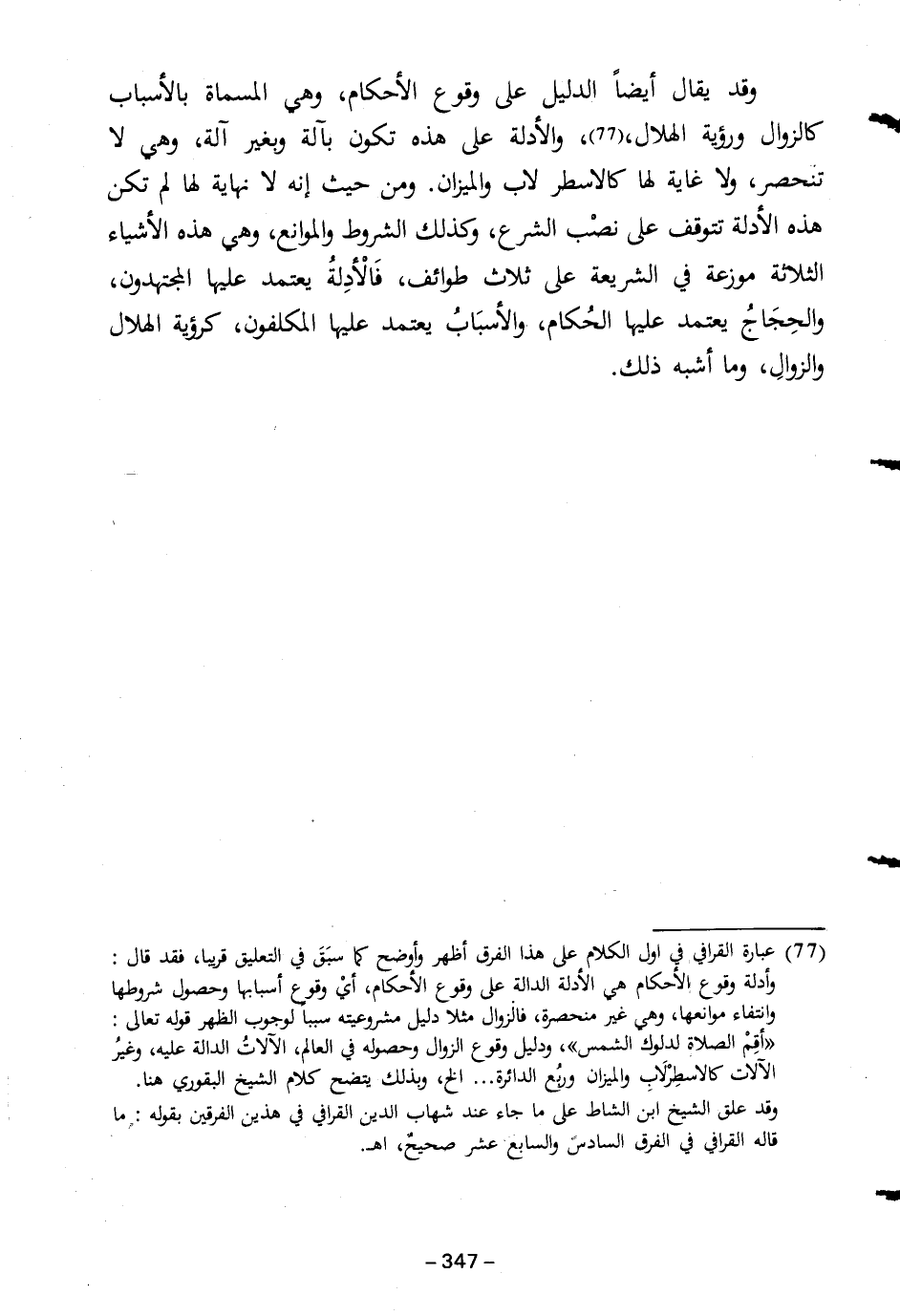 وقد يقال أيضاً الدليل على وقوع الأحكام، وهي المسماة بالأسباب كالزوال ورؤية الهلال، (٧٧)، والأدلة على هذه تكون بآلة وبغير آلة، وهي لا تنحصر، ولا غاية لها كالاسطر لاب والميزان. ومن حيث إنه لا نهاية لها لم تكن هذه الأدلة تتوقف على نصْب الشرع، وكذلك الشروط والموانع، وهي هذه الأشياء الثلاثة موزعة في الشريعة على ثلاث طوائف، فَالْأدِلةُ يعتمد عليها المجتهدون، والحِجَاجُ يعتمد عليها الحُكام، والأسبَابُ يعتمد عليها المكلفون، كرؤية الهلال والزوالَ، وما أشبه ذلك.
