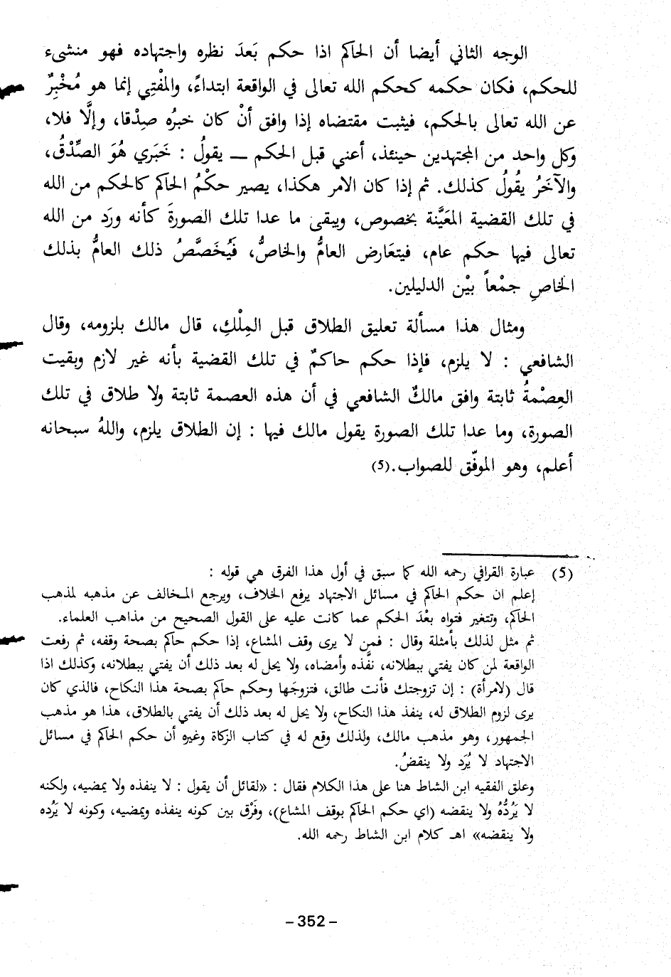 الوجه الثاني أيضا أن الحاكم إذا حكم بَعدَ نظره واجتهاده فهو منشئ للحكم، فكان حكمه كحكم الله تعالى في الواقعة ابتداءً، والمفْتِي إنما هو مُخْبِرٌ عن الله تعالى بالحكم، فيثبت مقتضاه إذا وافق أنْ كان خبرُه صِدْقا، وإلَّا فلا، وكل واحد من المجتهدين حينئذ، أعني قبل الحكم - يقوُل: خَبَري هُوَ الصِّدْقُ، والآخَرُ يقُوُل كذلك. ثم إذا كان الامر هكذا، يصير حكْمُ الحاكم كالحكم من الله في تلك القضية المعَيَّنة بخصوص، ويبقى ما عدا تلك الصورة كأنه ورَد من الله تعالى فيها حكم عام، فيتعَارض العامُّ والخاصُّ، فَيُخَصَّصُ ذلك العامُّ بذلك الخاصِ جمْعاً بيْن الدليلين.