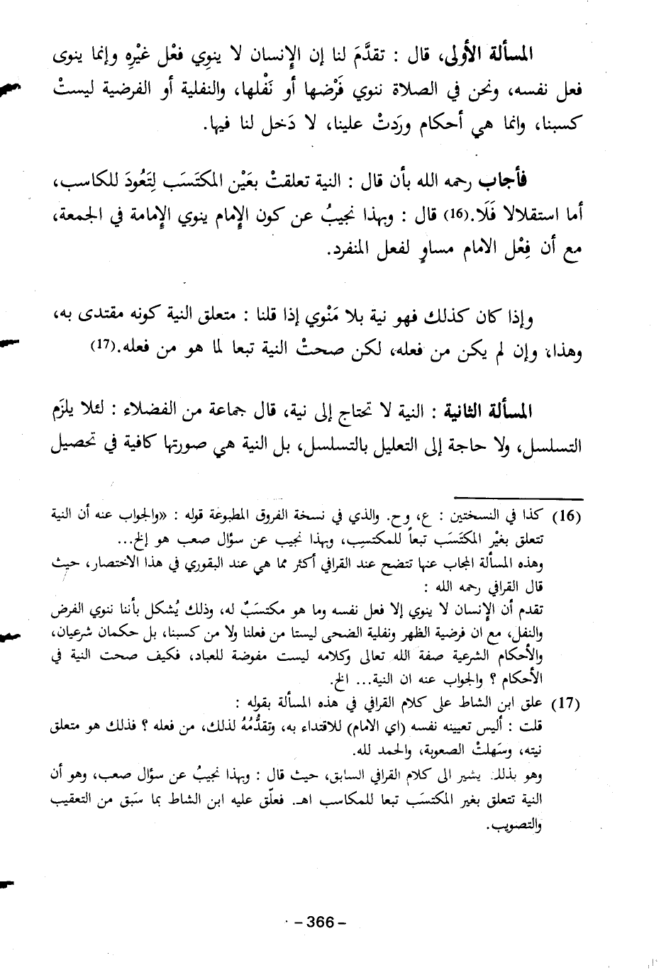 (١٦) كذا في النسختين: ع، وح. والذي في نسخة الفروق المطبوعة قوله: "والجواب عنه أن النية تتحلق بغيْر المكتَسَب تبعًا للمكتسِب، وبهذا نجيب عن سؤال صعب هو إلخ ...