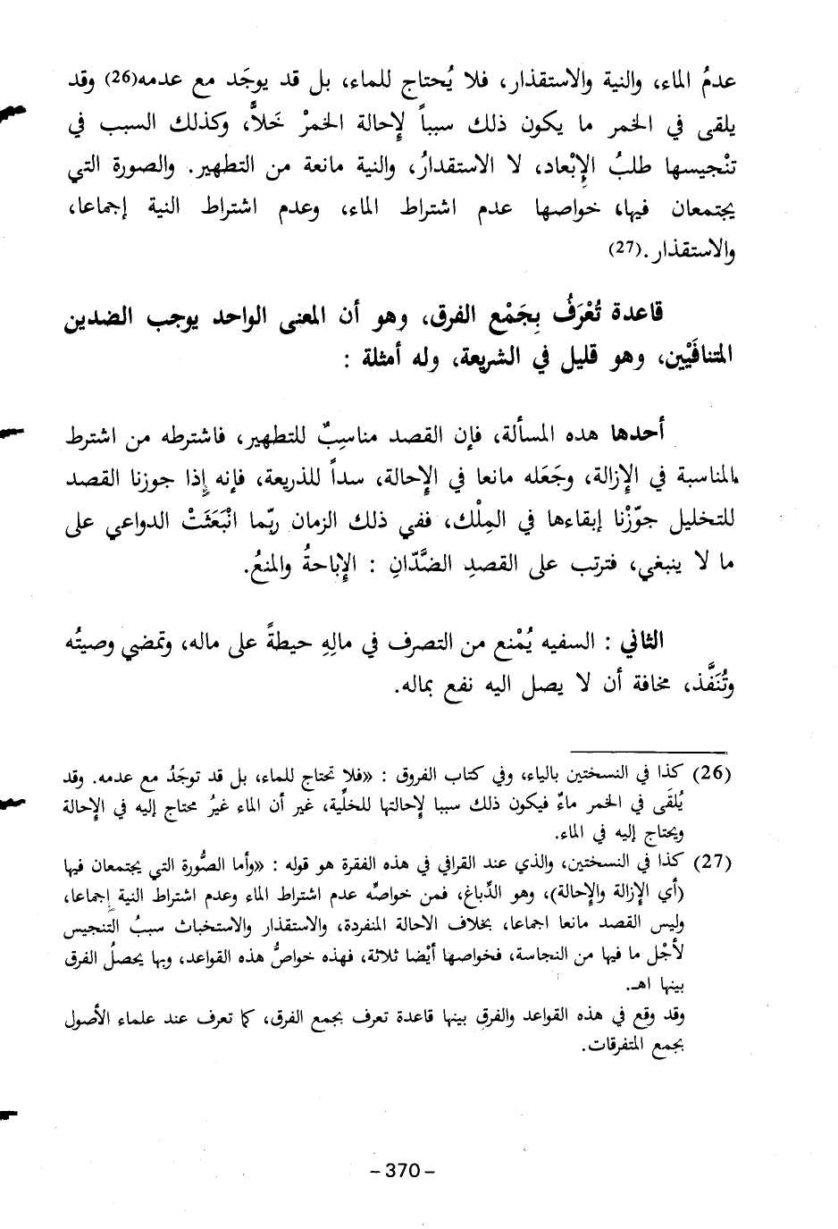 (٢٧) كذا في النسختين، والذي عند القرافي في هذه الفقرة هو قوله: "وأما الصُّورة التي يجتمعان فيها (أي الإزالة والإِحالة)، وهو الدِّباغ، فمن خواصِّه عدم اشتراط الماء وعدم اشتراط النية اجماعا، وليس القصد مانعا اجاعا، بخلاف الاحالة المنفردة، والاستقذار والاستخباث سببُ التنجيس لأجْل ما فيها من النجاسة، فخواصها أيْضا ثلاثة، فهذه خواصُّ هذه القواعد، وبها يحصلُ الفرق بينها اهـ.