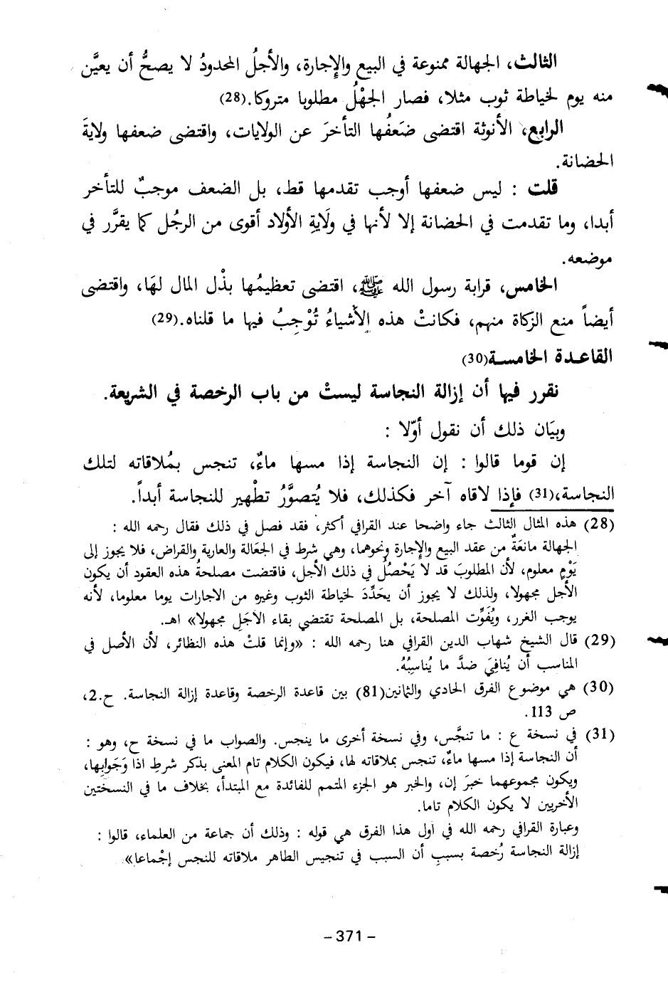 (٣٠) هي موضوع الفرق الحادي والثمانين (٨١) بين قاعدة الرخصة وقاعدة إزالة النجاسة. ح.٢، ص ١١٣.