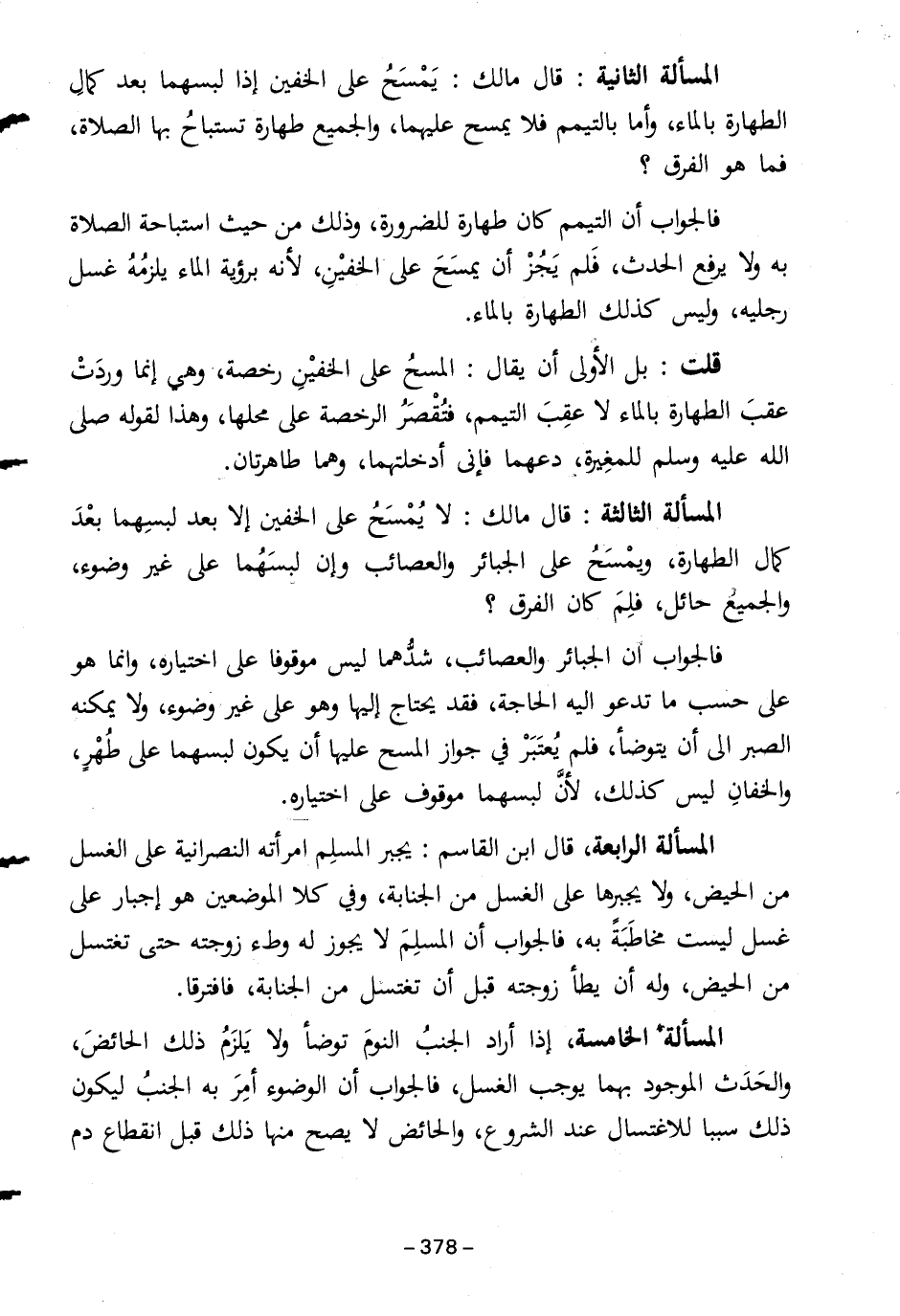 المسألة الثانية: قال مالك: يَمْسَحُ على الخفين إذا لبسهما بعد كمالَ الطهارة بالماء، وأما بالتيمم فلا يمسح عليهما، والجميع طهارة تستباحُ بها الصلاة، فما هو الفرق؟