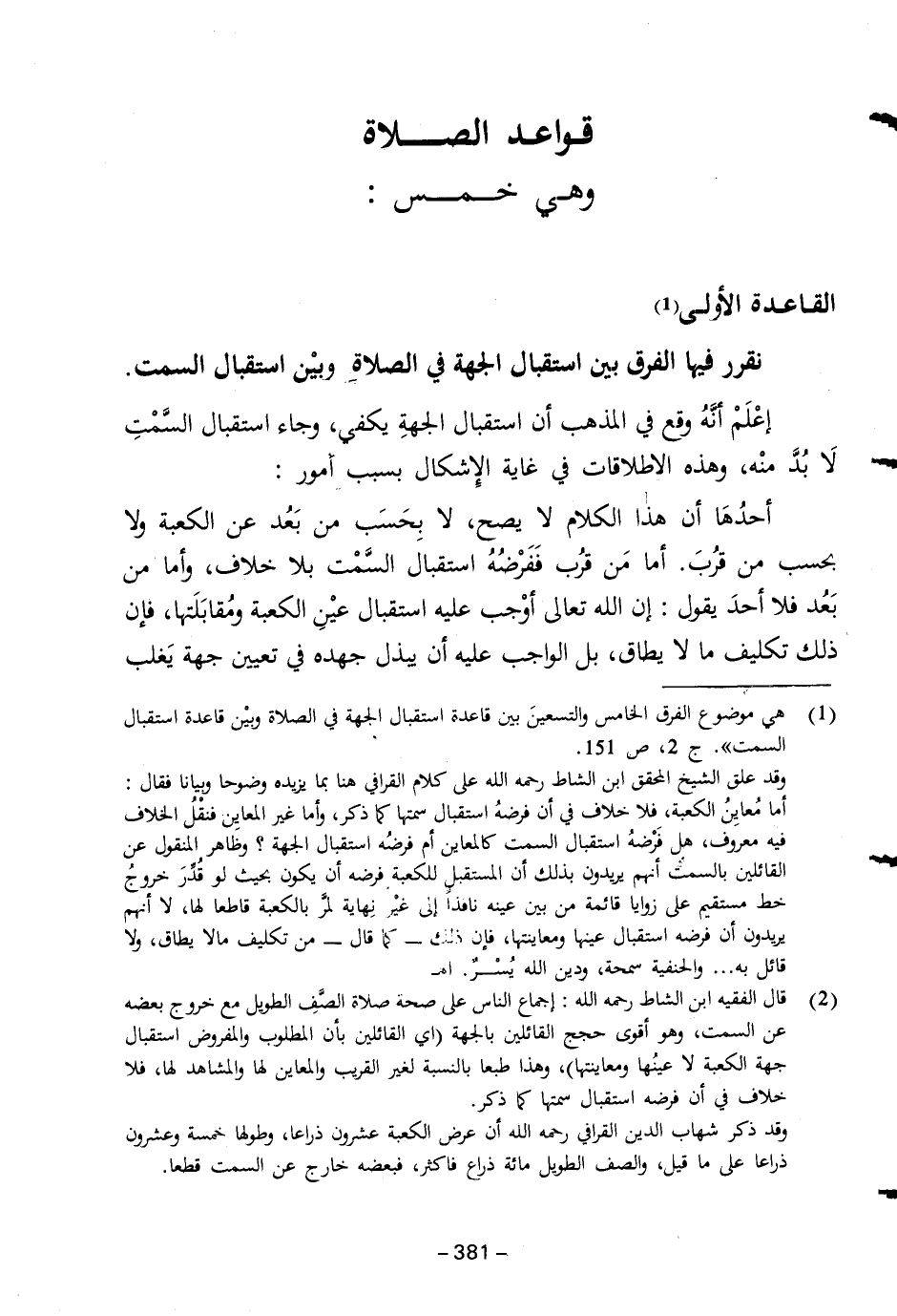 (١) هي موضوع الفرق الخامس والتسعينَ بين قاعدة استقبال الجهة في الصلاة وبيْن قاعدة استقبال السمت". جـ ٢، ص ١٥١.