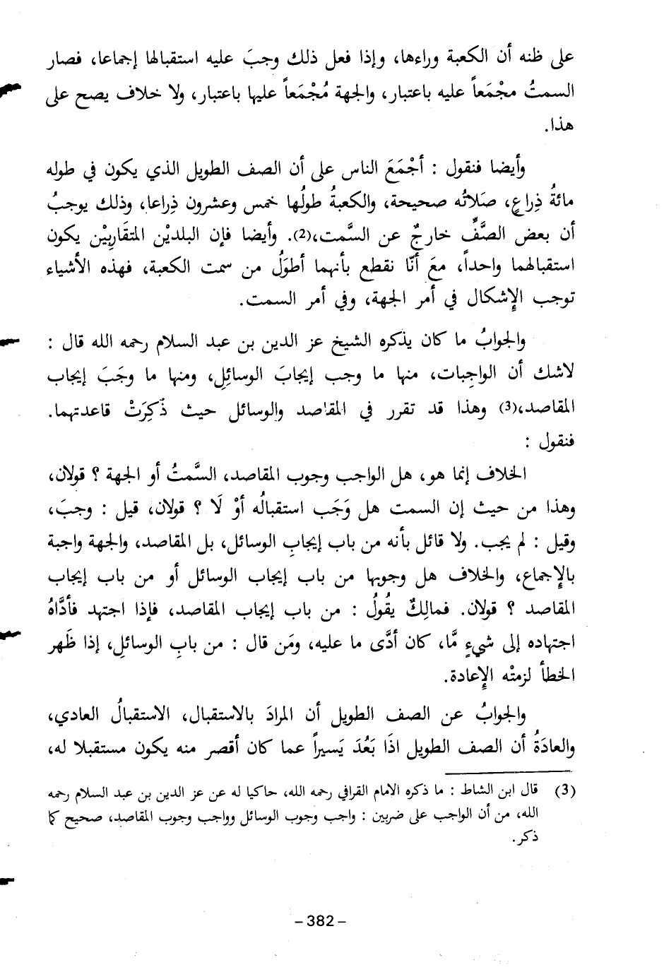 (٢) قال الفقيه ابن الشاط رحمه الله: (إجماع الناس على صحة صلاة الصَّفِ الطويل مع خروج بعضه عن السمت، وهو أقوى حجج القائلين بالجهة (اي القائلين بأن المطلوب والفروض استقبال جهة الكعبة لا عينُها ومعاينتها)، وهذا طبعا بالنسبة لغير القريب والمعاين لها والمشاهد لها، فلا خلاف في أن فرضه استقبال سمتها كما ذكر.