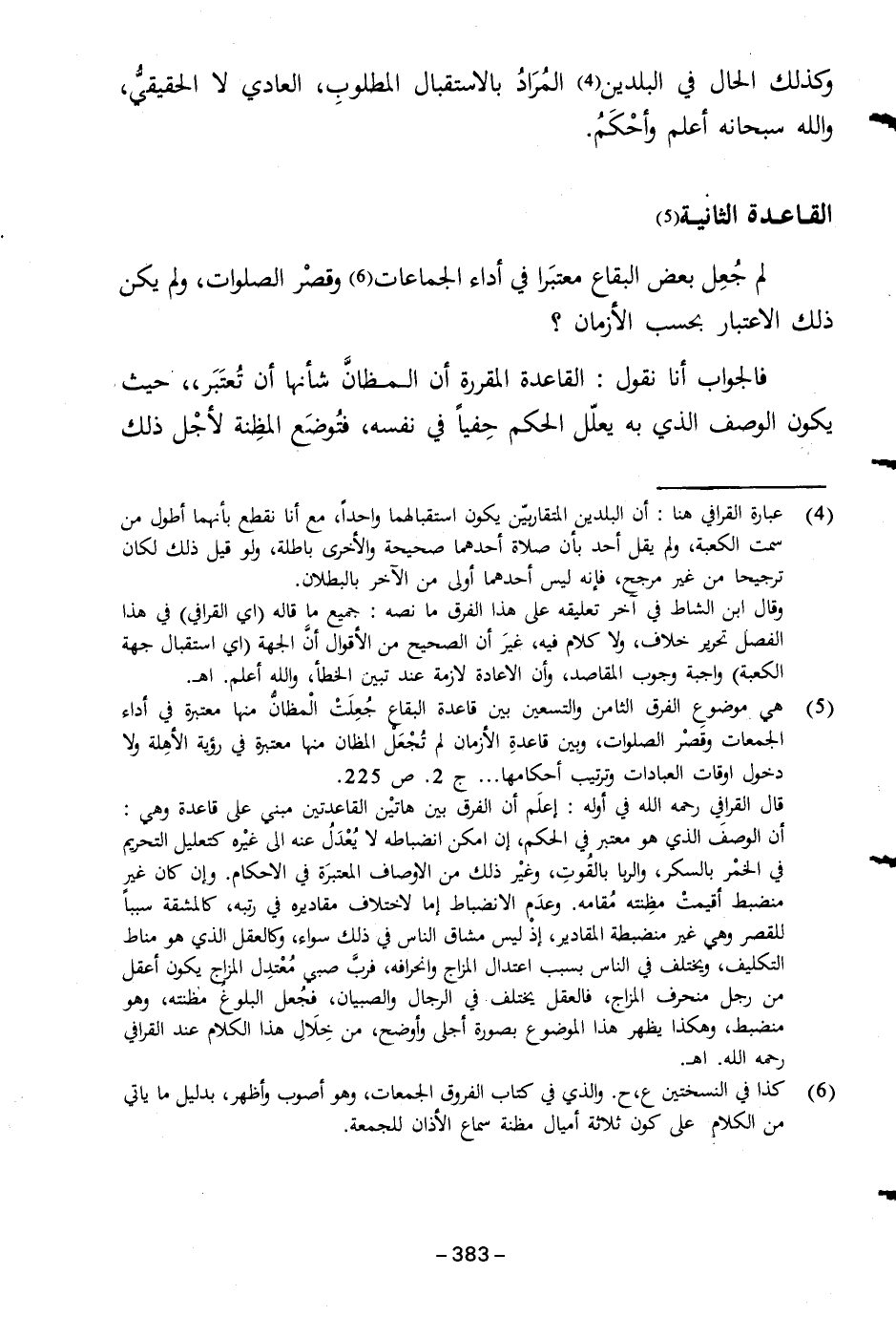 (٥) هي موضوعِ الفرق الثامن والتسعين بين قاعدة البقاع جُعِلَتْ الْمظانُّ منها معتبرة في أداء الجمعات وقصْر الصلوات، وبين قاعدةِ الأزمان لم تُجْعَلْ المظان منها معتبرة في رؤية الأهِلة ولا دخول اوقات العبادات وترتيب أحكامها ... جـ ٢. ص ٢٢٥.
