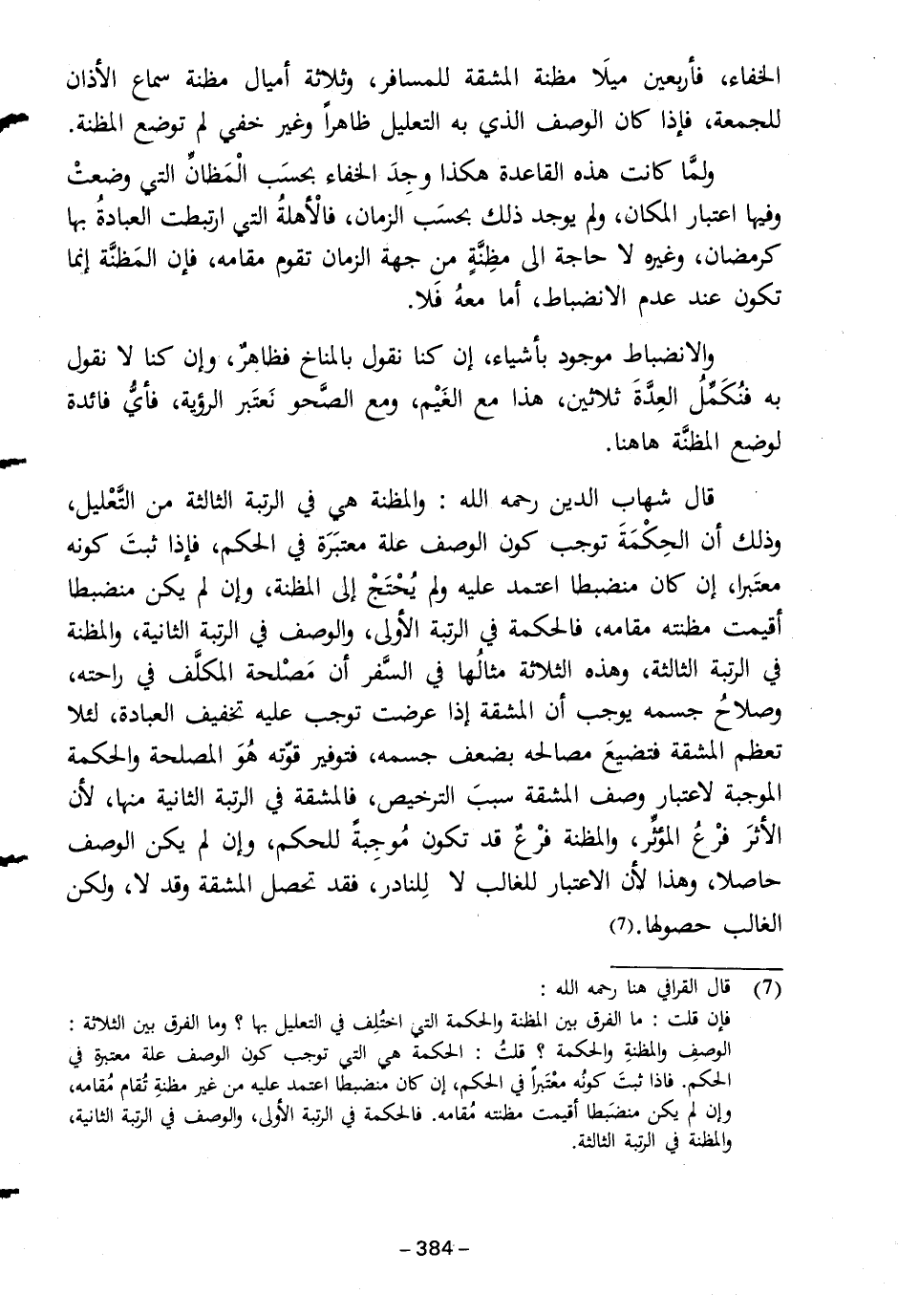 قال شهاب الدين رحمه الله: والمظنة هي في الرتبة الثالثة من التَّعْليل، وذلك أن الحِكْمَةَ توجب كون الوصف علة معتبَرَة في الحكم، فإذا ثبتَ كونه معتَبرا، إن كان منضبطا اعتمد عليه ولم يُحْتَجْ إلى المظنة، وإن لم يكن منضبطا أقيمت مظنته مقامه، فالحكمة في الرتبة الأولى، والوصف في الرتبة الثانية، والمظنة في الرتبة الثالثة، وهذه الثلاثة مثالُها في السَّفر أن مَصْلحة المكلَّف في راحته، وصلاحُ جسمه يوجب أن المشقة إذا عرضت توجب عليه تخفيف العبادة، لئلا تعظم الشقة فتضيعَ مصالحه بضعف جسمه، فتوفير قوّته هُوَ المصلحة والحكمة الموجبة لاعتبار وصف المشقة سببَ الترخيص، فالمشقة في الرتبة الثانية منها، لأن الأثرَ فرْعُ المؤثِّر، والمظنة فرْعٌ قد تكون مُوجِبةً للحكم، وإن لم يكن الوصف حاصلا، وهذا لأن الاعتبار للغالب لا لِلنادر، فقد تحصل المشقة وقد لا، ولكن الغالب حصولها. (٧)
